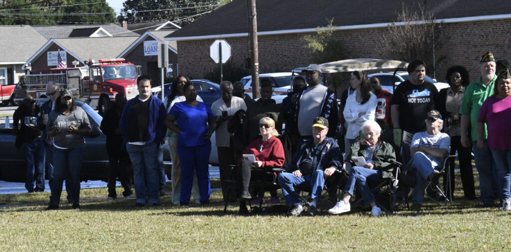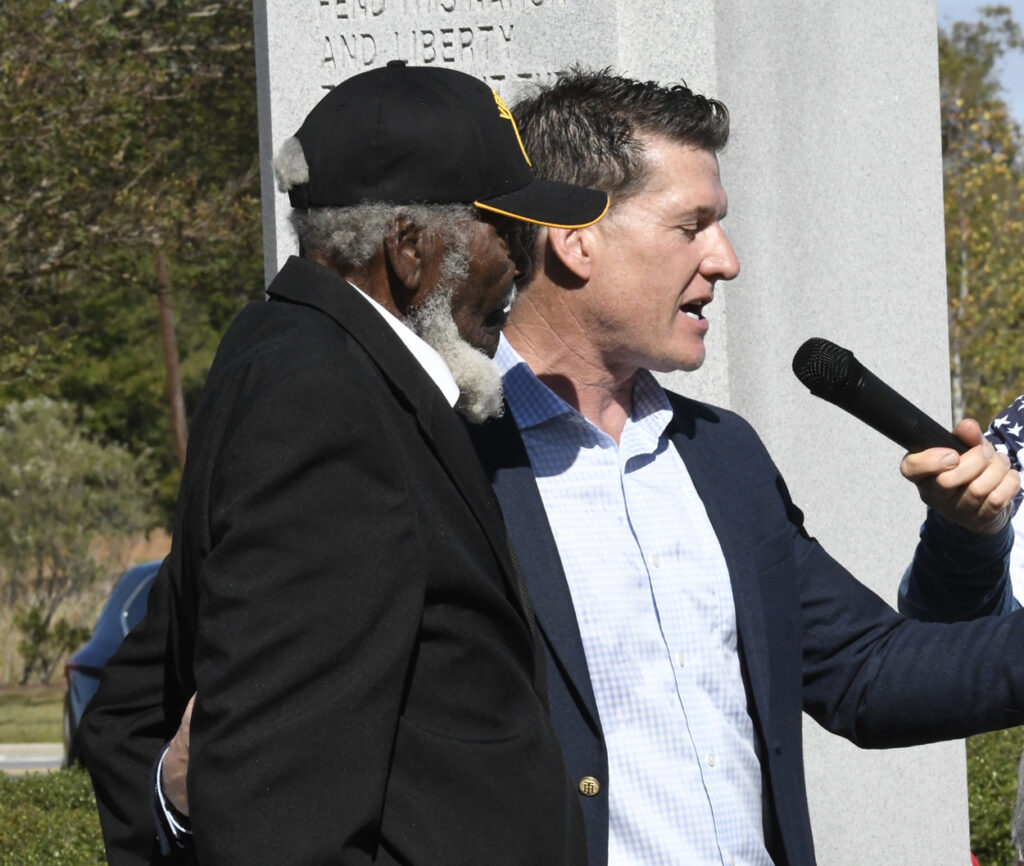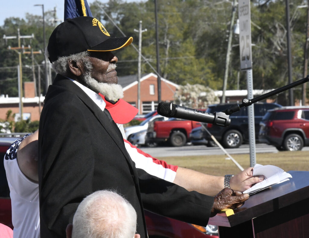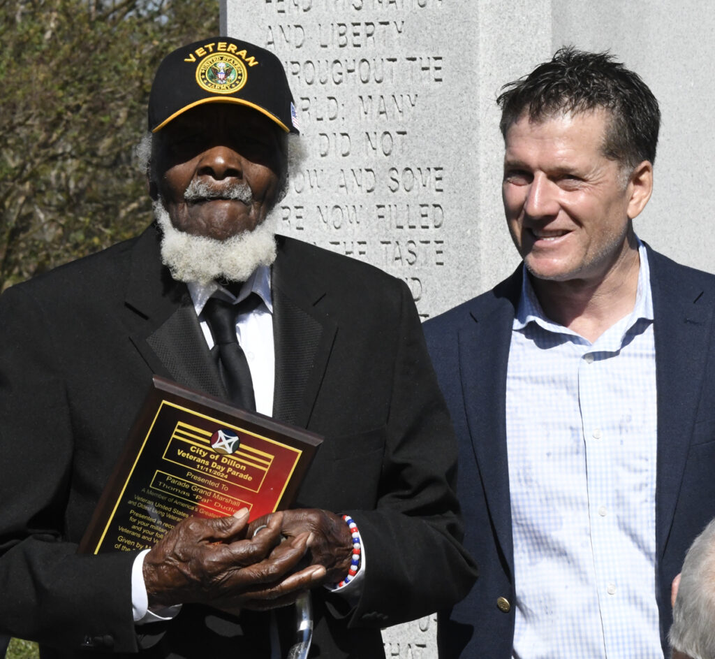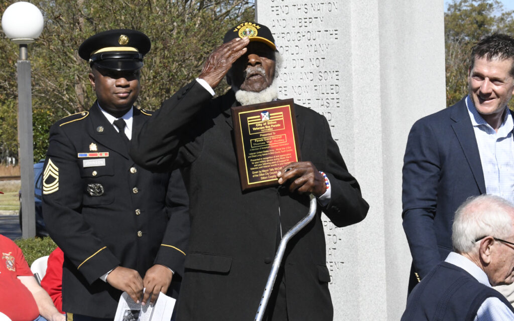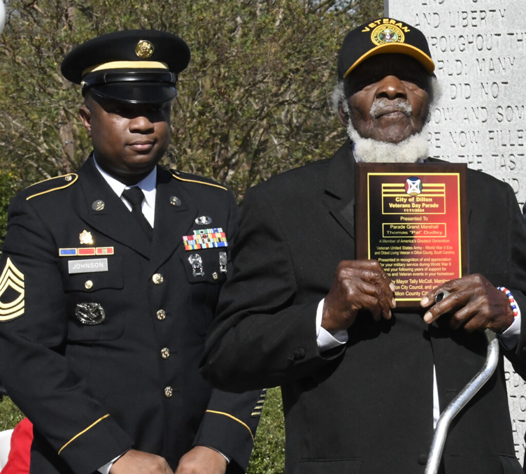 Dillon Mayor Tally McColl presented a plaque to Dillon County’s Oldest Living Veteran Thomas “Pal” Dudley at today’s Veterans Day Ceremony. Mr. Dudley was the Grand Marshal of today’s Veterans Day Parade. Mr. Dudley is 100 years old and served in World War II. In 1943 at the age of 19, Mr. Dudley was drafted into the army. After 18 months of service and with World War II over, Mr. Dudley returned to Dillon County, where he resumed his job at Dillon Veneer. Later, in 1970, he was asked to join the City of Dillon Police Department, where he served for 14 years. He is also known for selling produce at his roadside vegetable stand in the Little Rock area. He is a founding member of Friendship Baptist Church of Dillon. He thanked everyone for coming and participating today and said he had never seen this many people at a Veterans Day service. God Bless you all, every one, Mr. Dudley said.