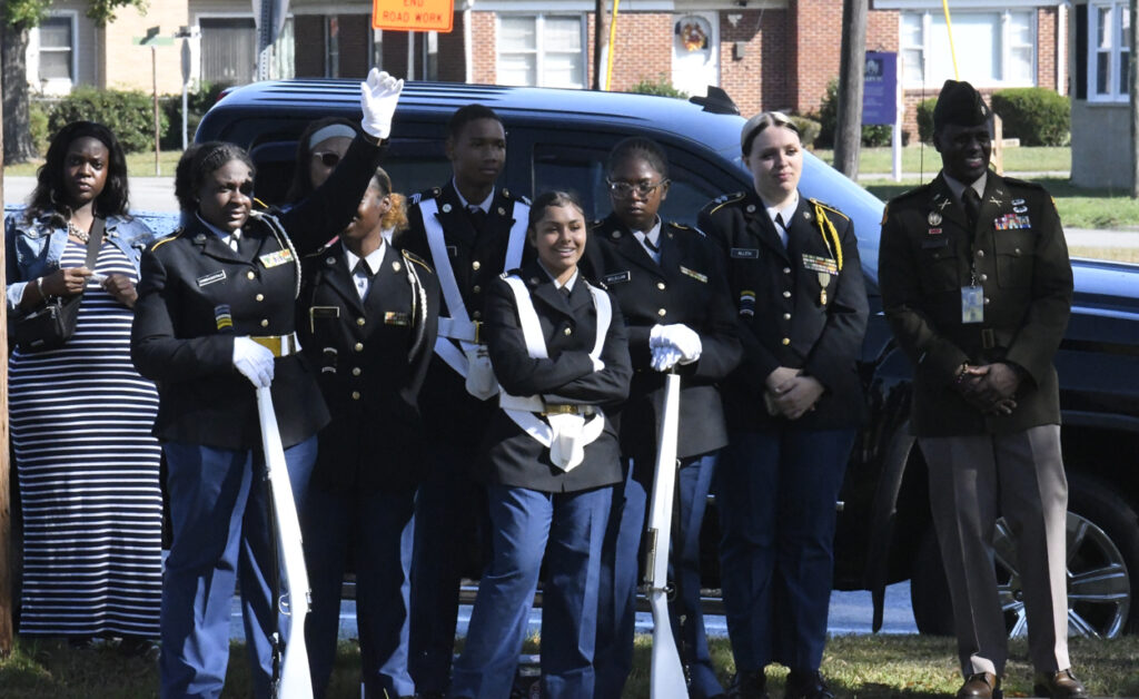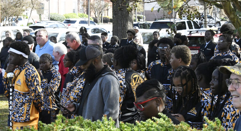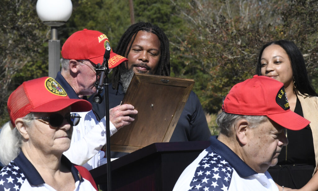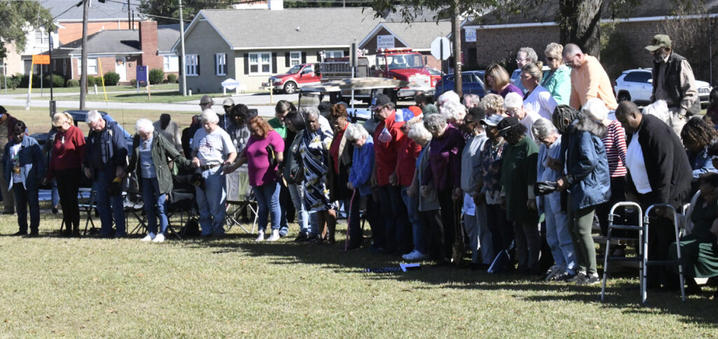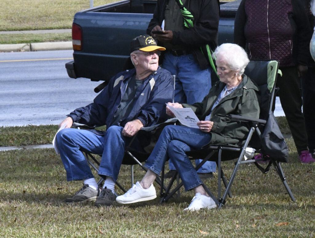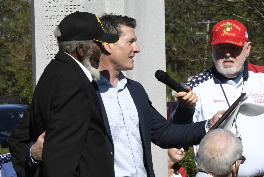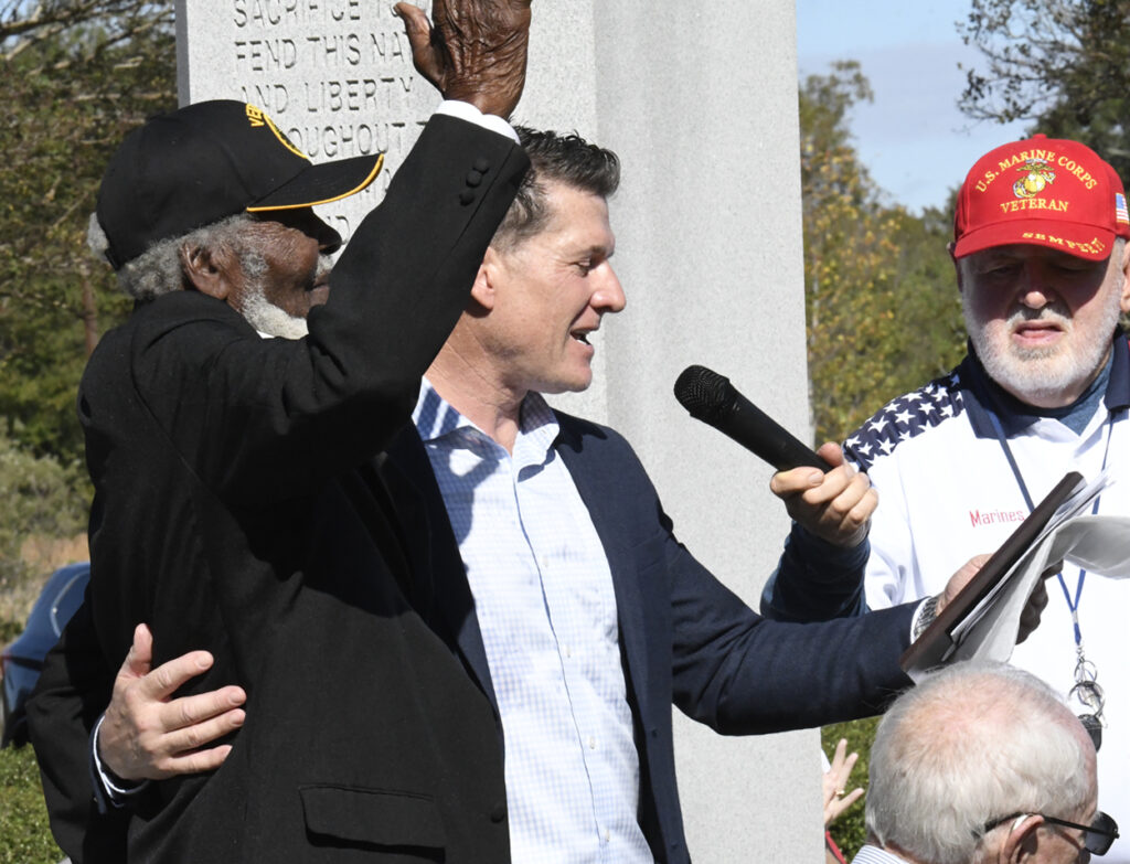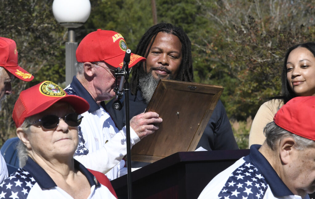 Dillon Mayor Tally McColl presented a plaque to Dillon County’s Oldest Living Veteran Thomas “Pal” Dudley at today’s Veterans Day Ceremony. Mr. Dudley was the Grand Marshal of today’s Veterans Day Parade. Mr. Dudley is 100 years old and served in World War II. In 1943 at the age of 19, Mr. Dudley was drafted into the army. After 18 months of service and with World War II over, Mr. Dudley returned to Dillon County, where he resumed his job at Dillon Veneer. Later, in 1970, he was asked to join the City of Dillon Police Department, where he served for 14 years. He is also known for selling produce at his roadside vegetable stand in the Little Rock area. He is a founding member of Friendship Baptist Church of Dillon. He thanked everyone for coming and participating today and said he had never seen this many people at a Veterans Day service. God Bless you all, every one, Mr. Dudley said.