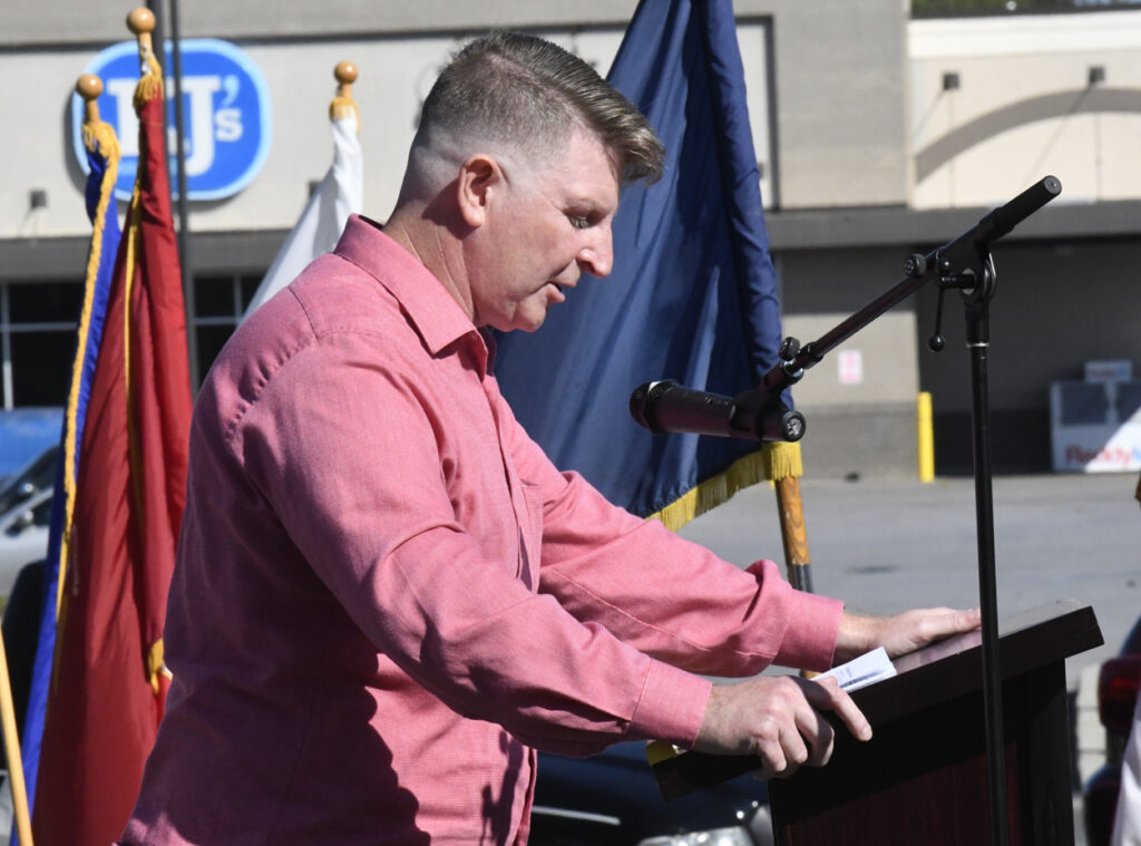 Chaplain David Morgan was the guest speaker at today’s Veterans Day program. Among the things he discussed was strategies for spiritual fitness. He named four things: 1) Community (The importance of having someone with shared experiences can foster that purpose.) 2) Reflection and Self-Care (This can include journaling and prayer.) 3) Selfless Service (This can be volunteering, mentoring, and having a purpose by serving others).; and 4) Trusing God. The audience seemed to enjoy his message.