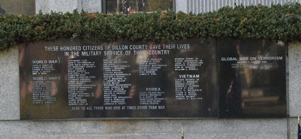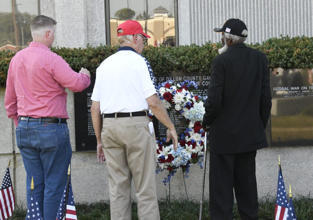 A wreath honoring veterans was placed by Chaplain David Morgan, Parade Grand Marshal Thomas “Pal ” Dugley, and Lloyd Brown, USAF. The wreath donated by South Carolina Senator Kent Williams. TAPS was played by Dillon High School Student, Cameron Ellison.