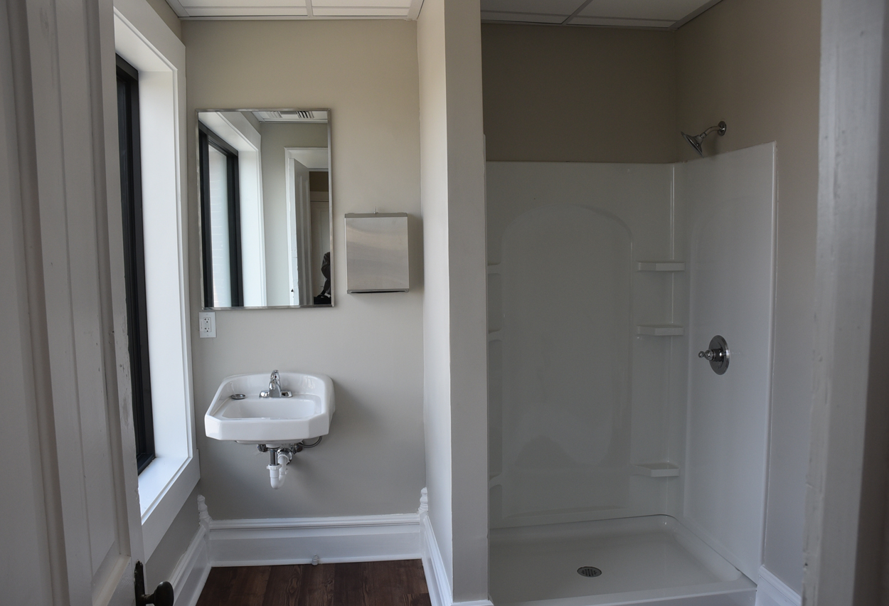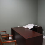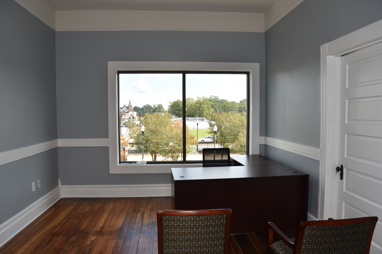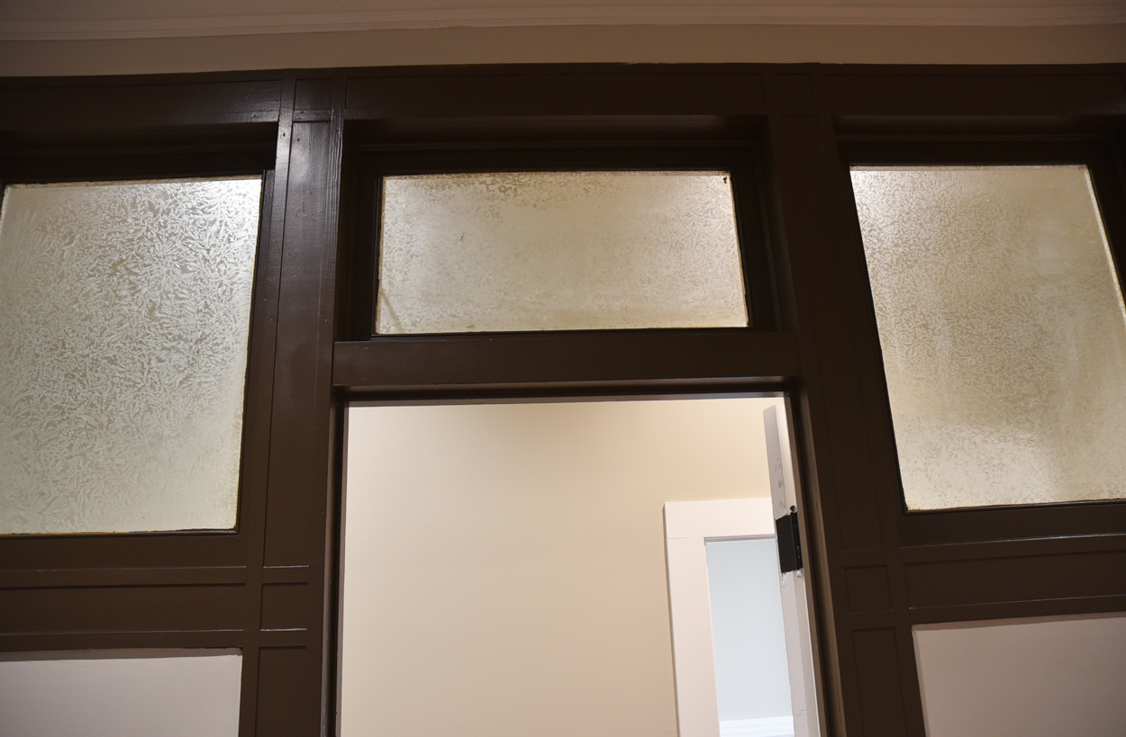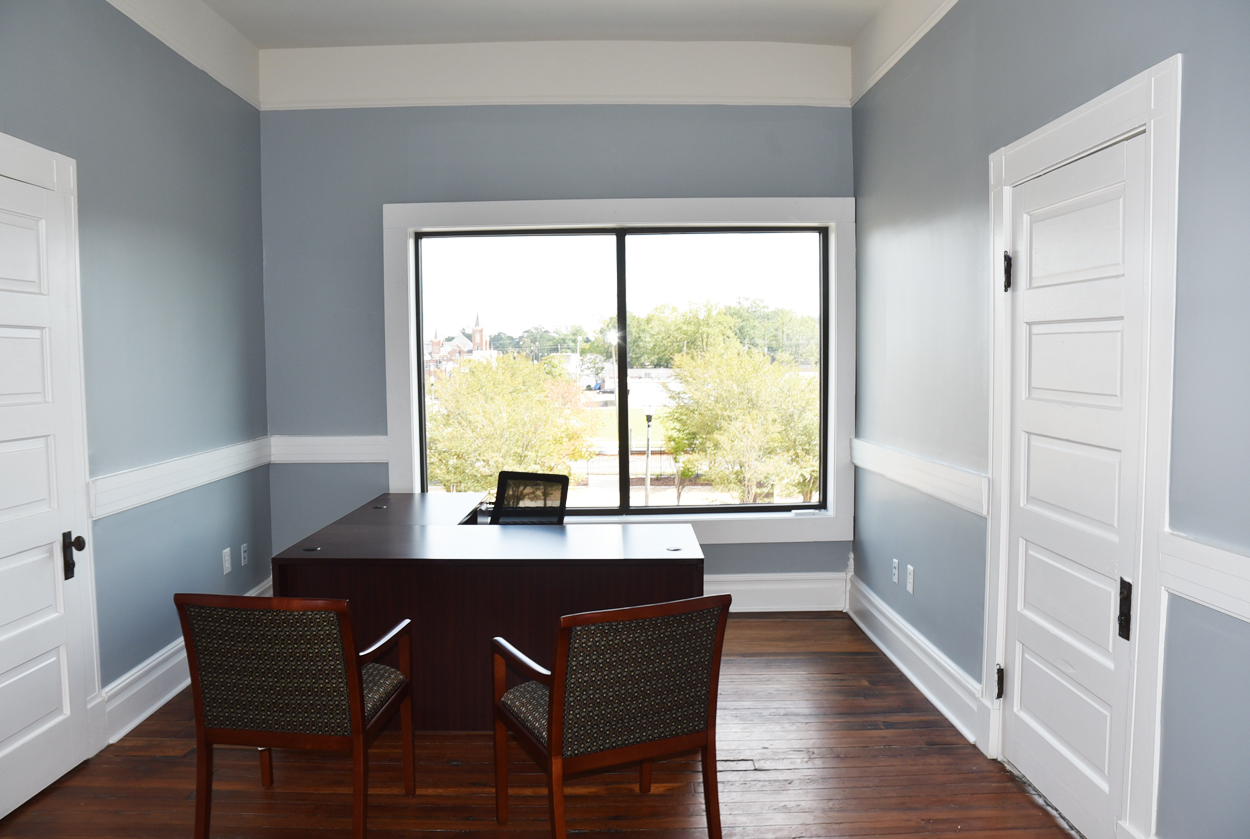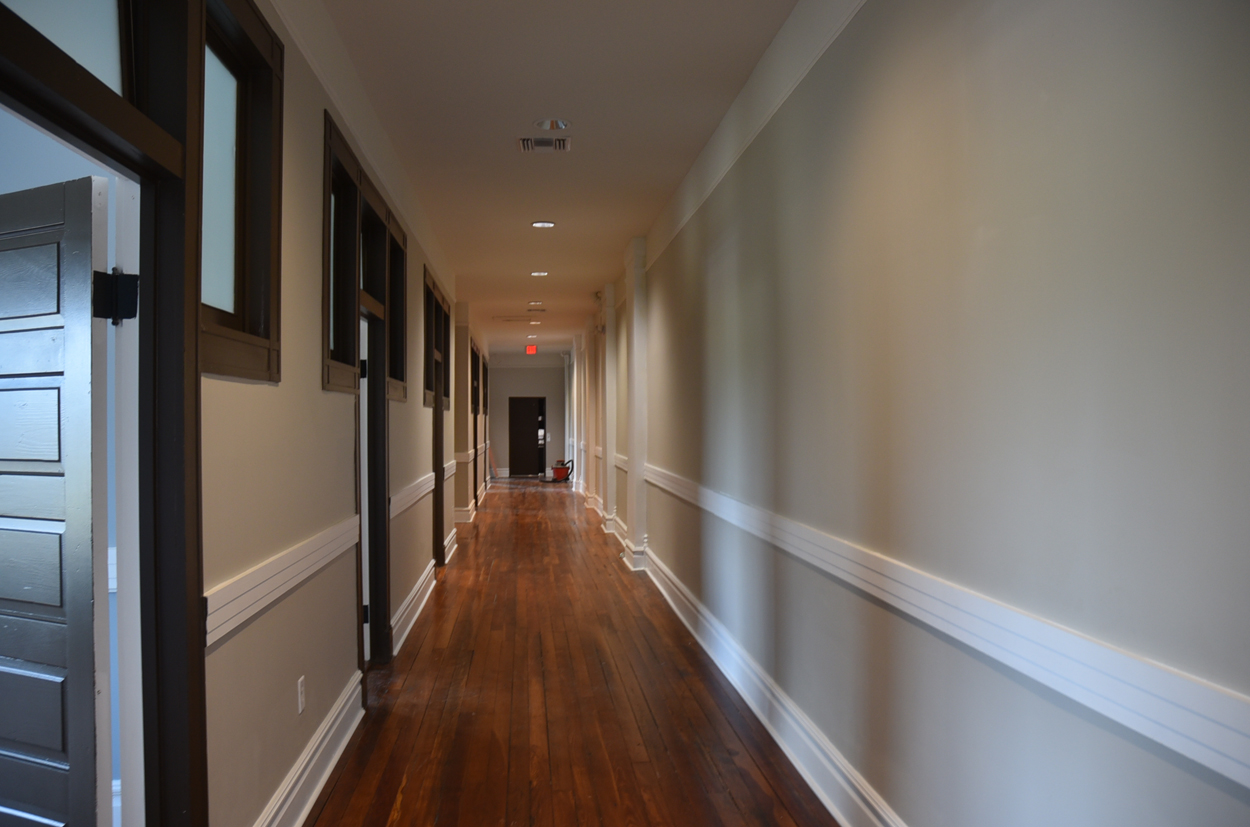 The staircase is the original and the original flooring is at the entrance to the stairs. The original wood is around the doors, and it was painted in keeping with the beauty of the building. There are several investigators offices, two interrogation rooms, the chief’s office which has an amazing view, a conference room, and two bathrooms, one of which has a shower in the event one is needed by an officer immediately. The colors upstairs also add to the overall charm of the renovation.
