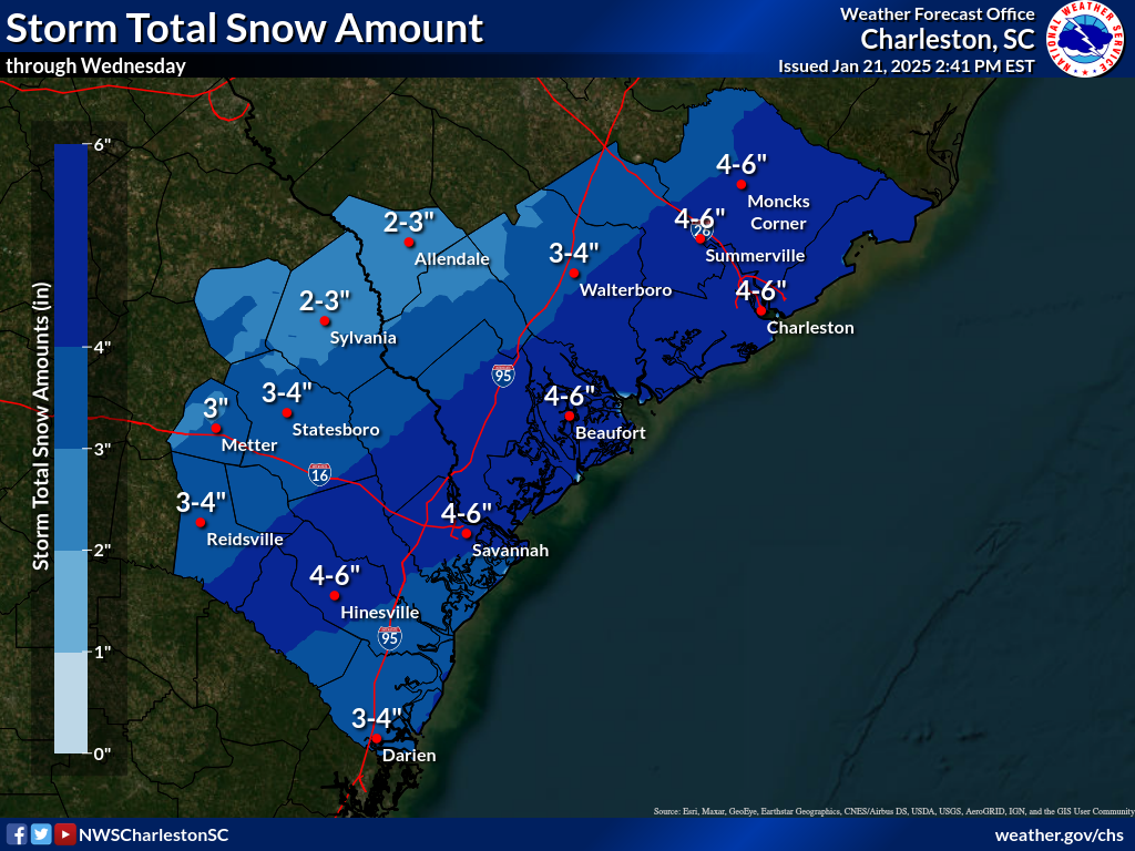 * Mixing with sleet and perhaps freezing rain along the Lowcountry coast could limit snow totals. If it stays mainly snow, 6 inches is possible, which would be near historic amounts for the area.