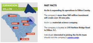Arclin, a materials science company, announced today (Monday) it is expanding its operations in Dillon County. The company’s more than $60 million investment will create over 30 new jobs.