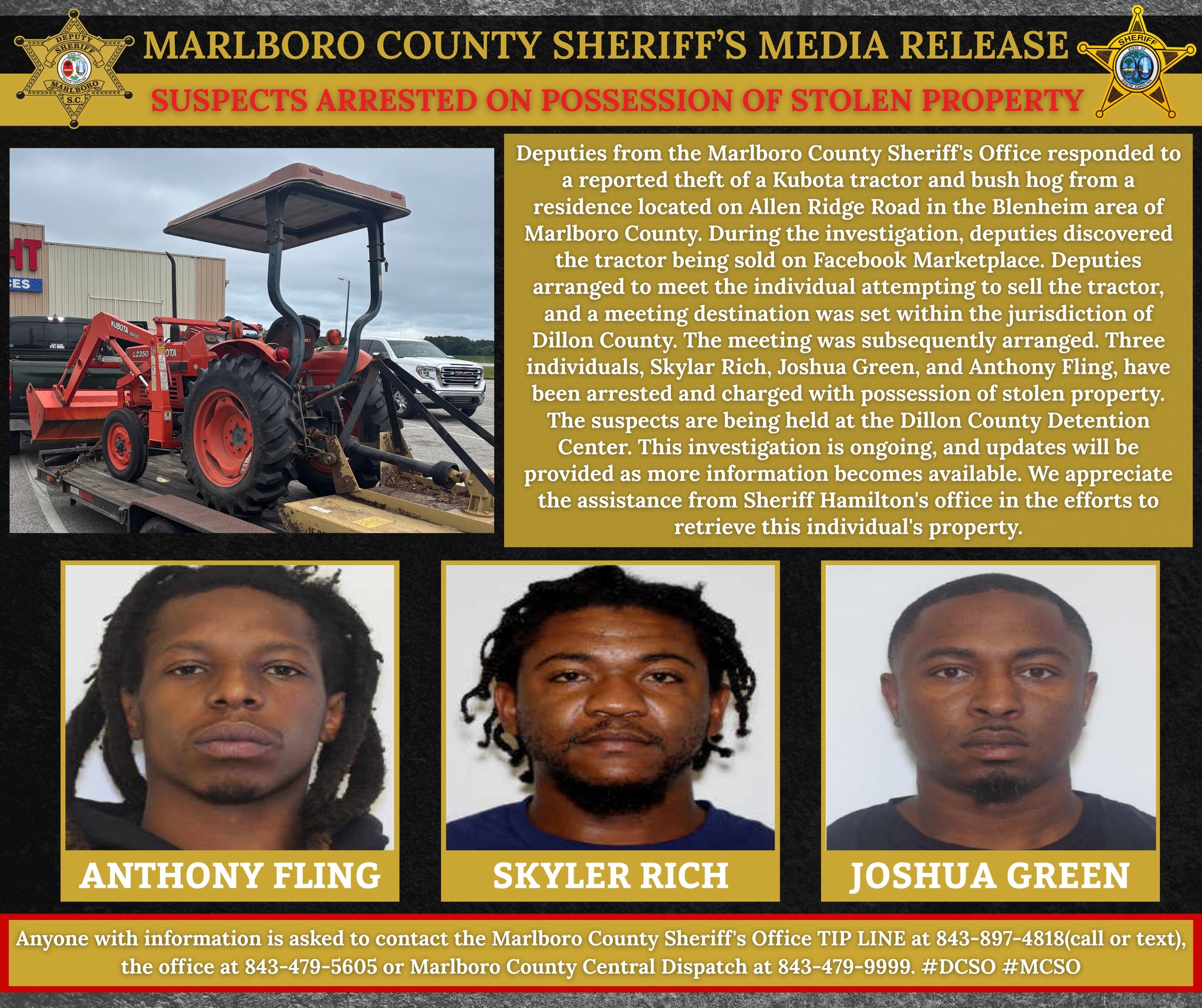 Deputies from the Marlboro County Sheriff’s Office responded to a reported theft of a Kubota tractor and bush hog from a residence located on Allen Ridge Road in the Blenheim area of Marlboro County. During the investigation, deputies discovered the tractor being sold on Facebook Marketplace. Deputies arranged to meet the individual attempting to sell the tractor, and a meeting destination was set within the jurisdiction of Dillon County. The meeting was subsequently arranged. Three individuals, Skylar Rich, Joshua Green, and Anthony Fling, have been arrested and charged with possession of stolen property. The suspects are being held at the Dillon County Detention Center. This investigation is ongoing, and updates will be provided as more information becomes available. We appreciate the assistance from Sheriff Hamilton’s office in the efforts to retrieve this individual’s property.