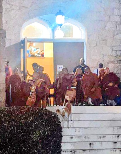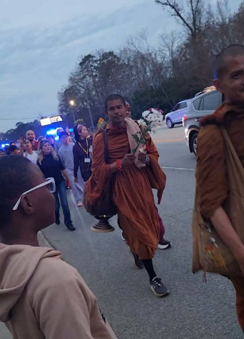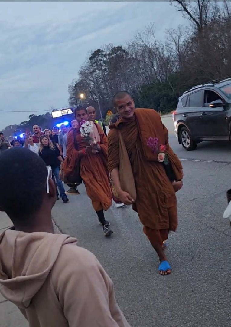 On day 77 of their journey, Buddhist Monks and their dog, Aloka, came to Columbia, South Carolina today, Saturday, January 10, on their 120 day, 2,300 mile walk for peace. They started in Fort Worth, Texas, and are traveling to Washington, D.C. They are seeking “to raise awareness of peace, loving kindness, and compassion across America and the world,” according to their social media page. Thousands of people turned out to see the monks including Belva and Savannah Britt of Latta. They received bracelets blessed by the monks. The monks are staying at Lutheran Theological Seminary before continuing their journey on Sunday.