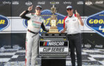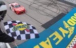 DARLINGTON, SOUTH CAROLINA – MAY 11: Justin Allgaier, driver of the #7 BRANDT Heritage Chevrolet, takes the checkered flag to win the NASCAR Xfinity Series Crown Royal Purple Bag Project…
