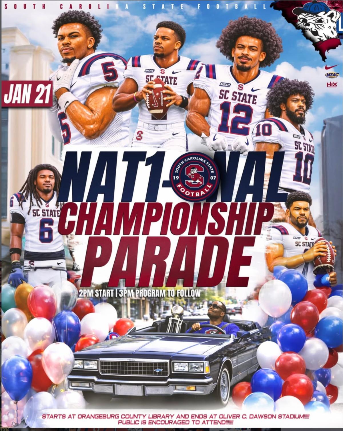 Pack the SC State campus on Wednesday, Jan. 21, to celebrate the Bulldogs’ 2025 National Championship. The parade starts at 2 p.m. at the Orangeburg County Library and finishes at Oliver C. Dawson Stadium, where we will honor the champs!