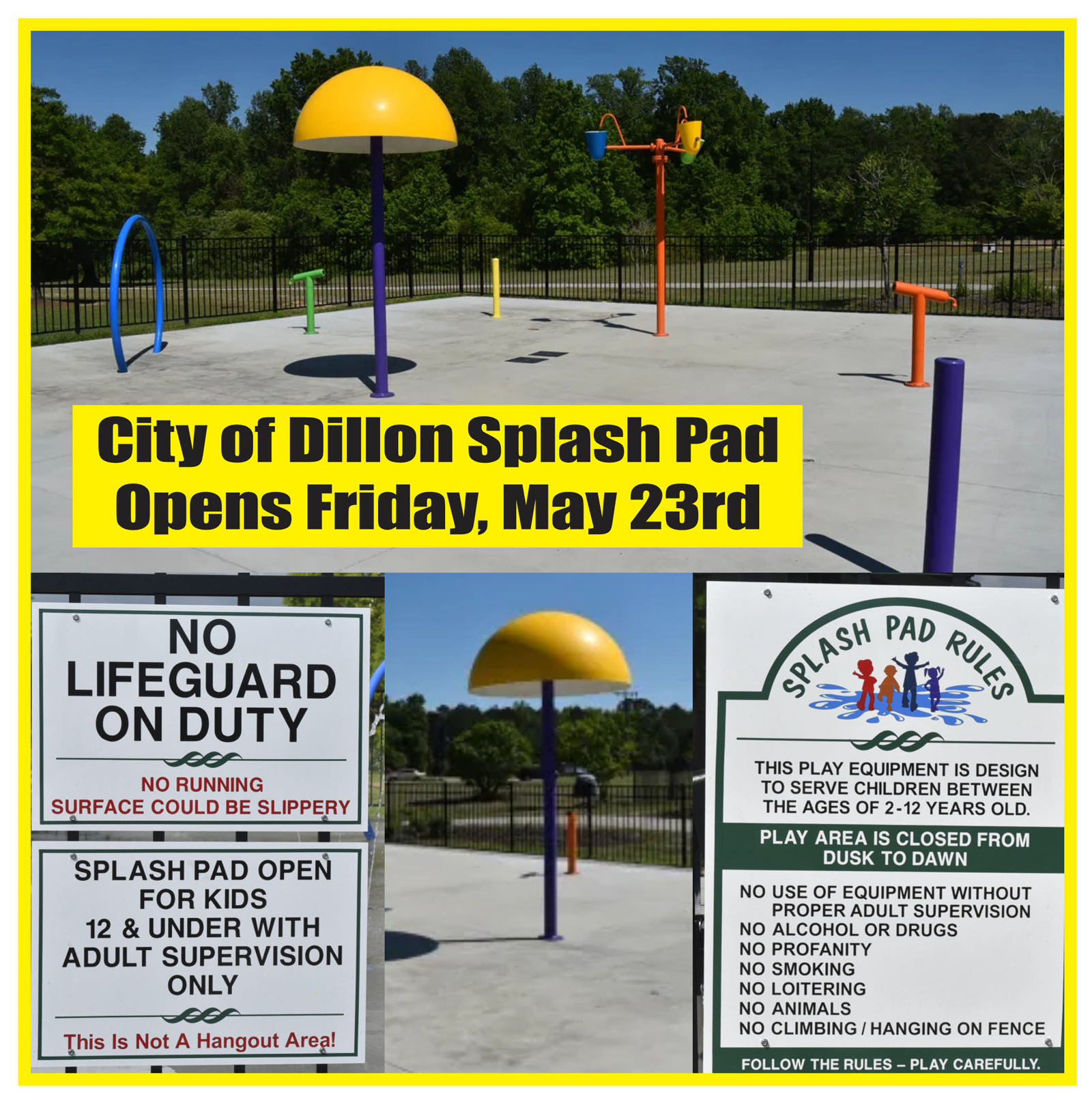 It’s that time of year again…time for the kids to have some fun splashing around at the City of Dillon Splash Pad. The splash pad opens Friday, May 23rd. The equipment here is designed for kids ages 2-12 years old, and the play area is closed from dusk to dawn. Kids must have proper adult supervision, and no animals are allowed. Running is not allowed because the surface could be slippery. Also no alcohol, drugs, profanity, smoking, loitering, or climbing/hanging on the fence are allowed. There is no lifeguard on duty. Everyone is asked to follow the rules, and have a great time! (Photos/Dillon County News, LLC)