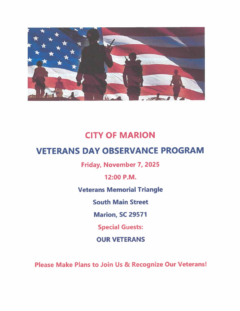 The City of Marion invites you to join us for our Veterans Day Observance Program on Friday, November 7, 2025, at 12:00 p.m. The ceremony will be held at the Veterans Memorial Triangle, located on South Main Street in Marion, South Carolina.