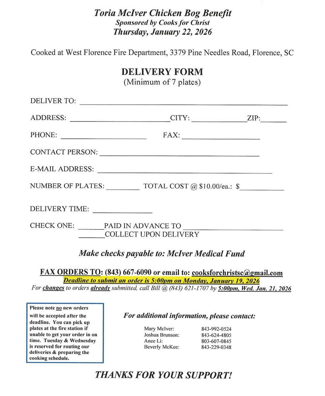 Toria’s benefit will be held on Thursday, January 22, 2026, at the West Florence Fire Station, 3379 Pine Needles Road in Florence, SC. Meals will be served from 11:00a.m. until 6:00 p.m. Drive-thru lanes will be open for your convenience, and a bake sale will be held all day. Plates are $10 each. Meals can be delivered for orders of 7 or more plates. To schedule a delivery, please complete a delivery form and fax or email according to the instructions provided on the form. The menu consists of chicken bog, green beans, slaw, and a slice of bread. To donate, please make checks payable to McIver Medical Fund. Cash and checks only – Debit/credit cards not accepted. For additional information, please contact Mary Mciver @ 843-992-0524, Joshua Brunson at 843-624-4805, Anee Li @ 803-607-0845, or Beverly McKee @ 843-229-0348.