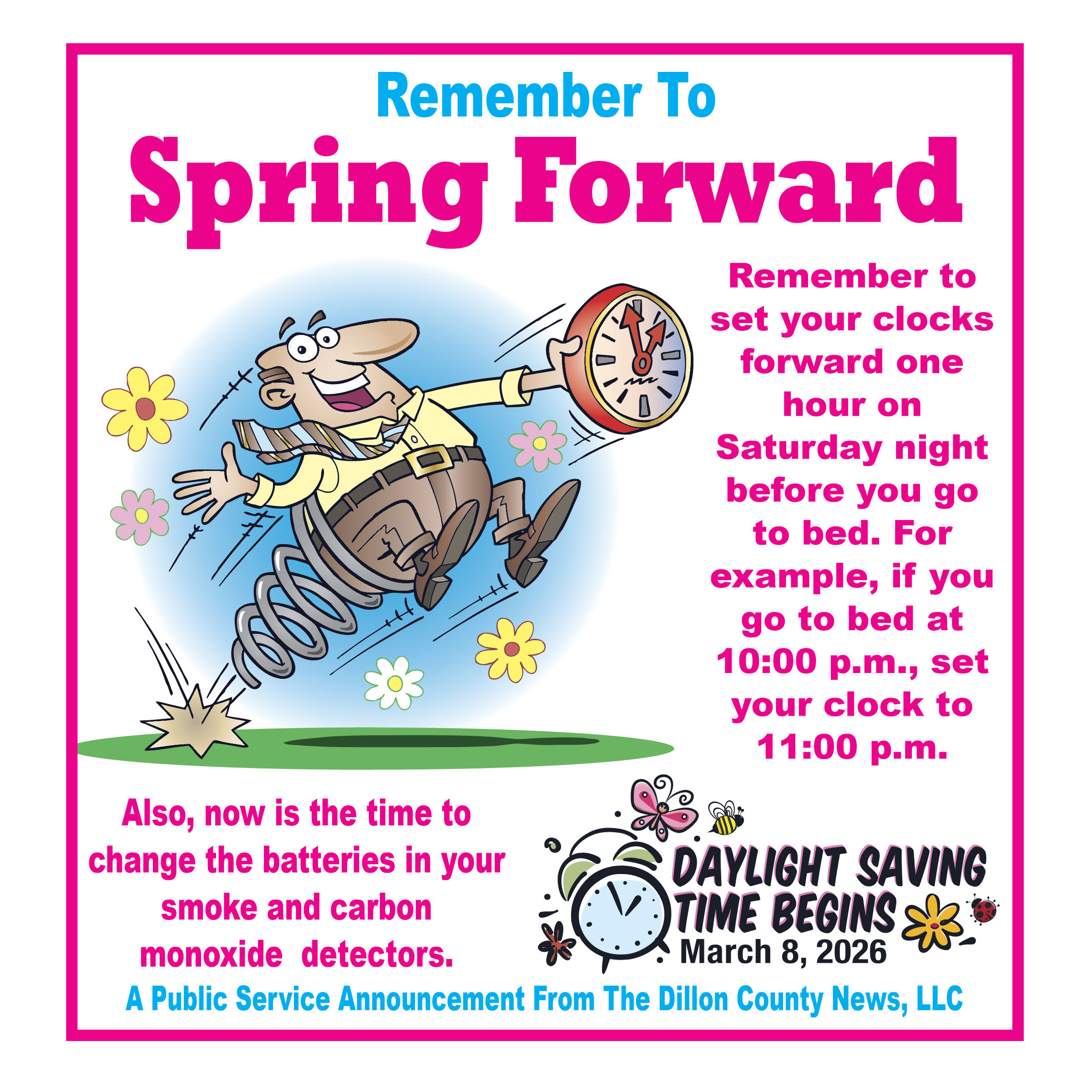 Daylight Saving Time begins March 8th. Remember to set your clocks forward and check those detectors!