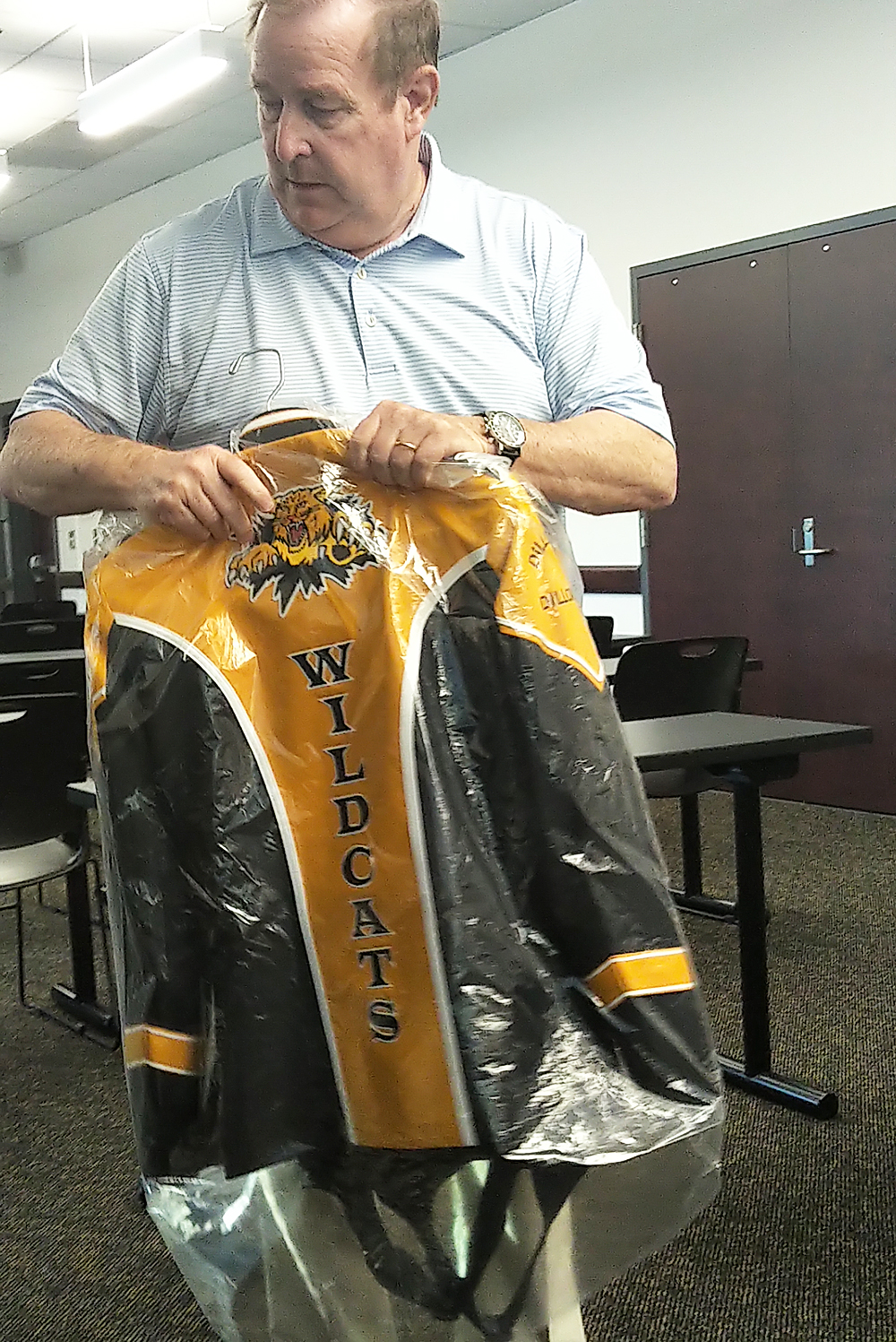 Pictured is Jackie Hayes showing the new uniforms to the board.
