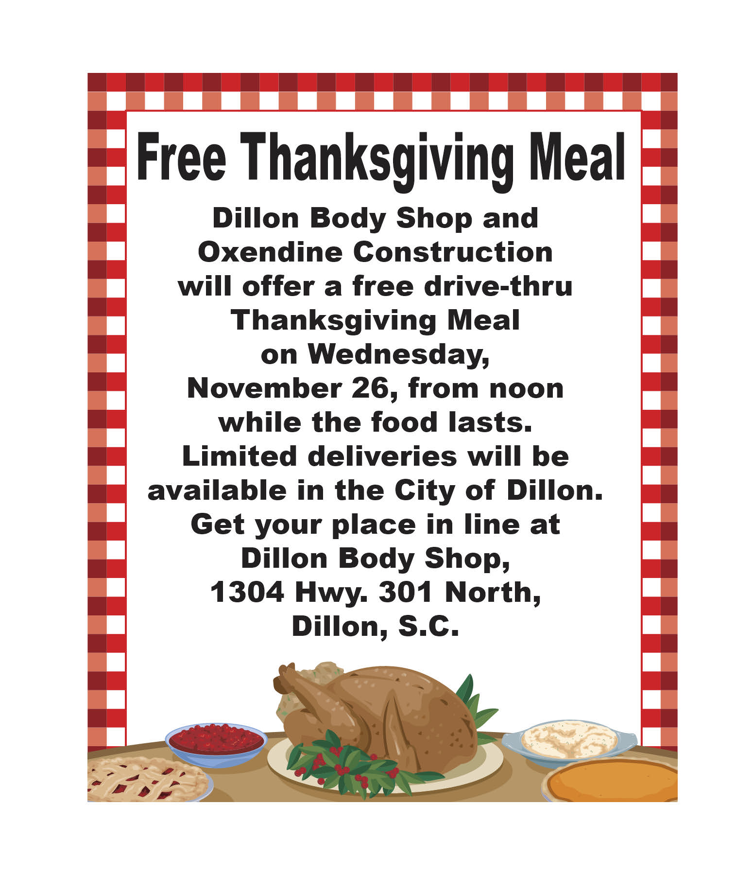 Dillon Body Shop and Oxendine Construction offering free Thanksgiving meal. See details above.