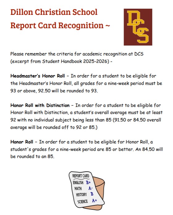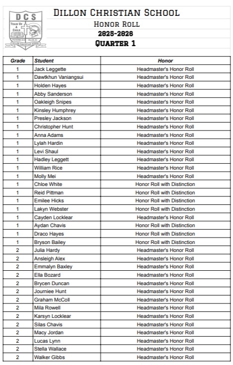 • Dillon Christian School Announces Quarter 1 Honor Roll