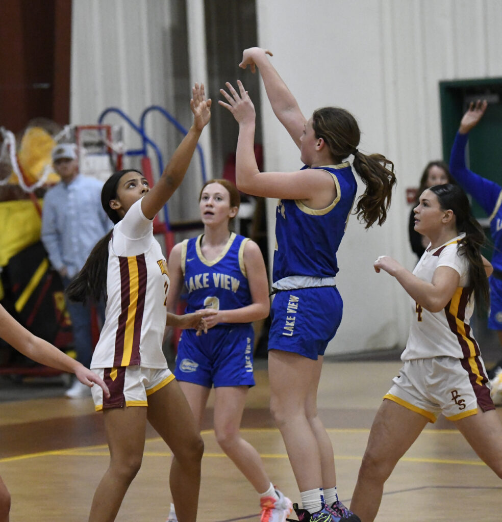 Dillon Christian School controlled the opening tipoff, and Shelby Dial sank a 2-point basket that was followed by another Dillon 2-point basket. Lake View’s Callie Smith answered with a 3-point basket. A scramble for a loose ball provided some excitement prior to the Warriors’ Lily King who hit a 2-point basket. With 2:24 remaining in the first quarter, Lily King scored a 2-point shot followed by another 2-point basket. Lake View’s Lily English sank a free throw.