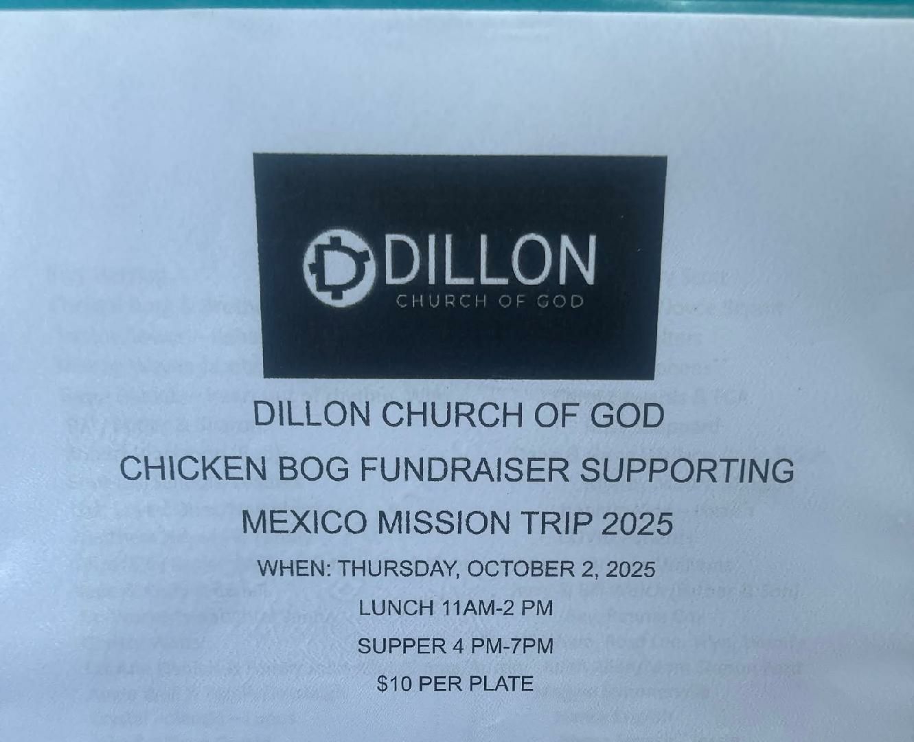 The Dillon Church of God is holding a chicken bog fundraiser for a Mexico Mission Trip On Thursday, October 2. Lunch 11 a.m.-2 p.m. and supper 4 p.m.-7 p.m.