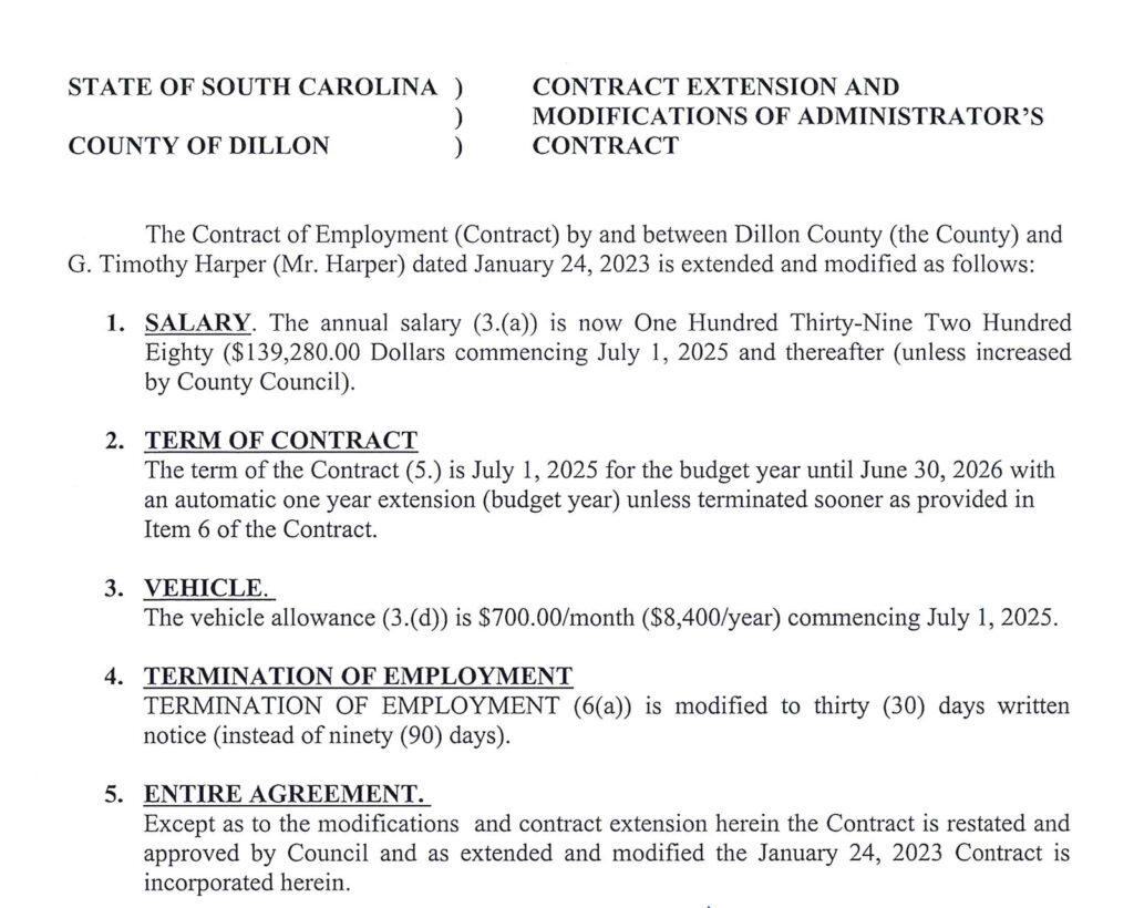 The Dillon County Council approved a contract extension and modifications of the previous contract for Dillon County Administrator Tim Harper at their June meeting.