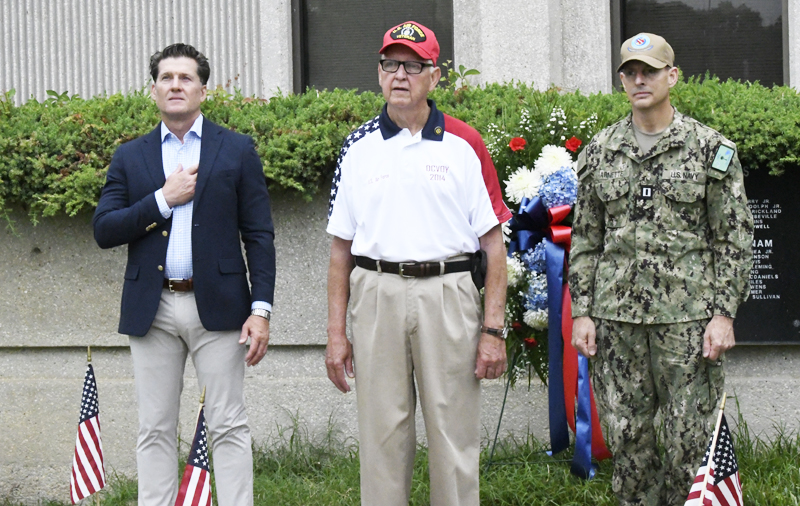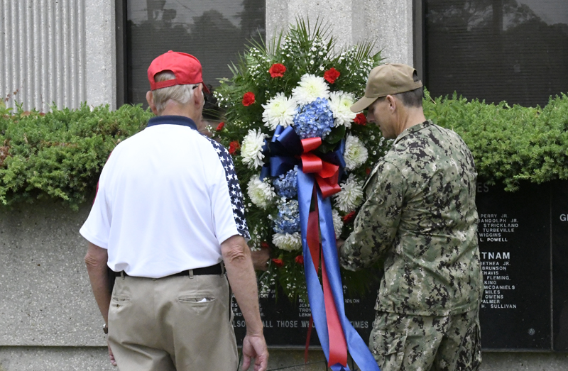 Wreath Honoring our War Dead: Dillon Mayor Tally McColl and Navy Chaplain Jamie Arnette. Assisted by USAF Veteran Lloyd Brown. Wreath donated by Army Veteran Harry Moore & family in memory of Army Vietnam War Veteran Sergeant Fred Moore.