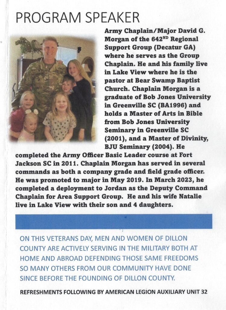 The annual Dillon County Veterans Day ceremony will be held on Monday, November 11th, at 11:00 a.m., the 11th month on the 11th day at the 11th hour at Veterans Square at 401 W. Main Street. A Veterans Parade (see separate post) will take place at 10:30 a.m. on Main Street, Dillon.