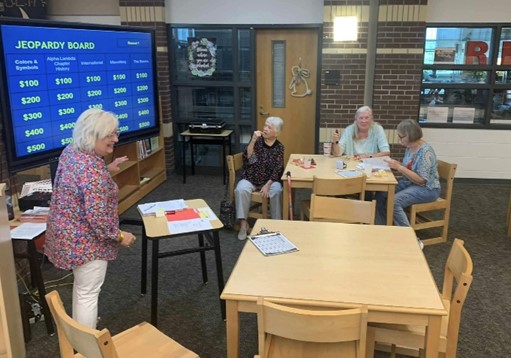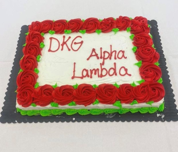Members in attendance enjoyed refreshments, including a cake adorned with red roses (the official flower of DKG) contributed by Mary Freitas. Members also enjoyed a competitive testing of their DKG knowledge by playing DKG Jeopardy.