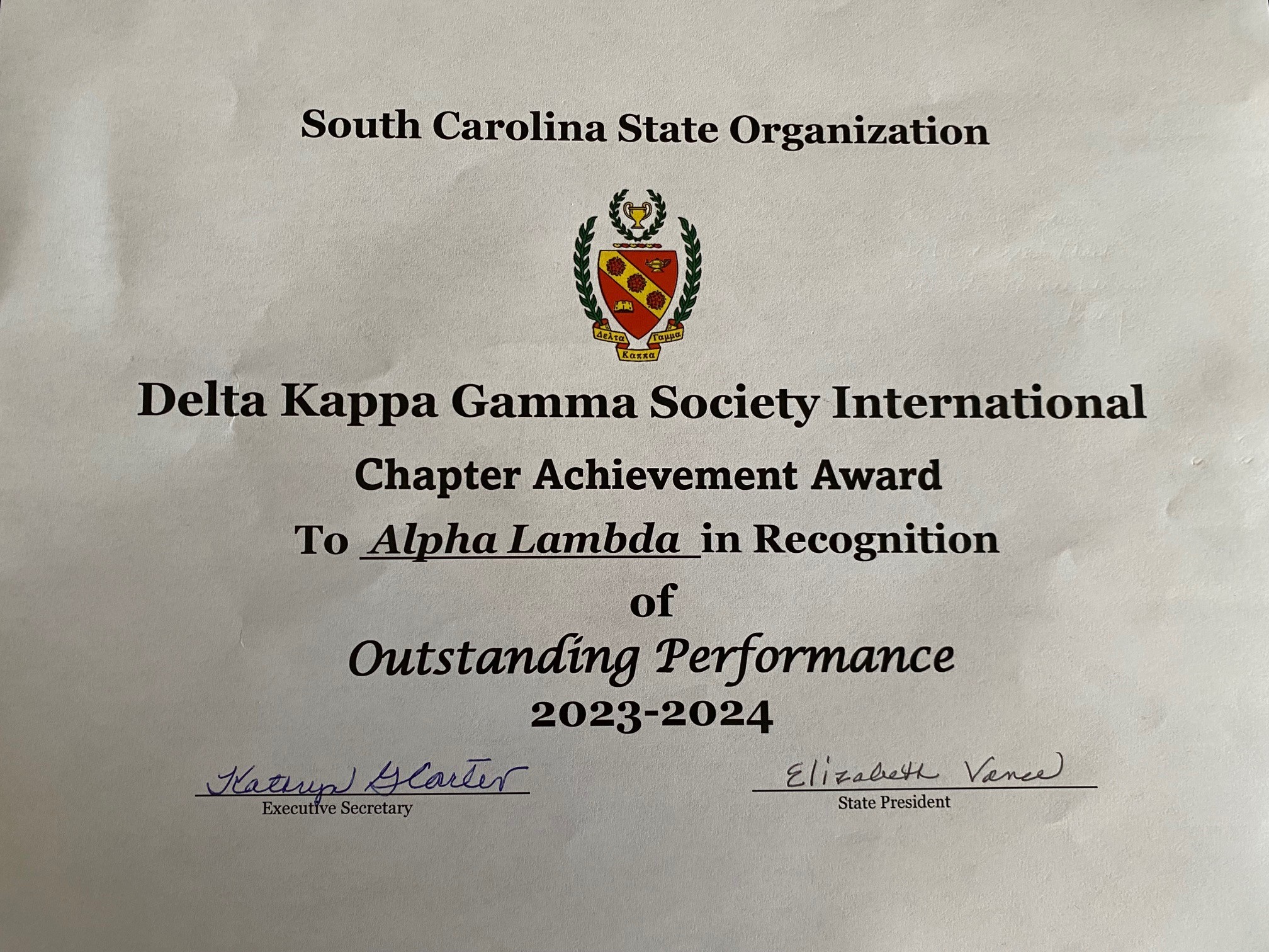 Dillon County’s Alpha Lambda Chapter of The Delta Kappa Gamma Society International recently held an end-of-year meeting which included a number of celebrations: Alpha Lambda Chapter’s 47th birthday, DKG International’s 96th birthday, Nan Carmichael’s 30th year of membership, Beth Jackson’s 15th year of membership, Susan Bryson’s appointment as the SC State Organization’s Assistant Treasurer, and Alpha Lambda Chapter’s “Outstanding” Achievement Award from the SC State Organization.