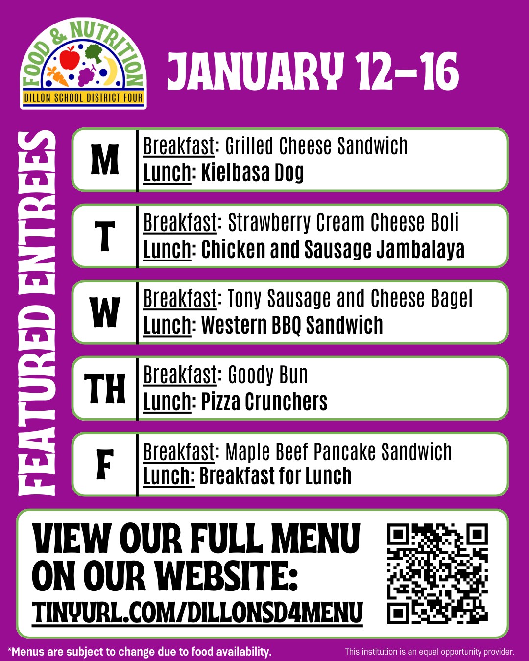Dillon District Four Breakfast and Lunch Menus: January 12-16