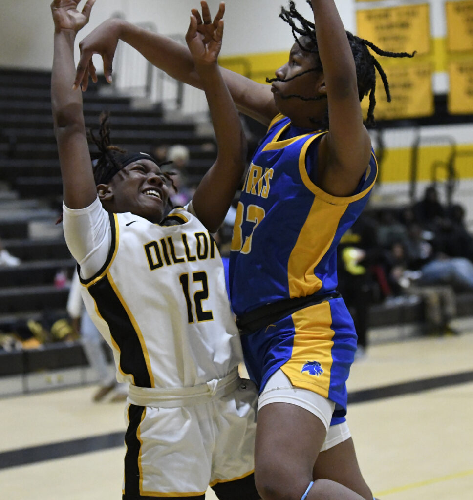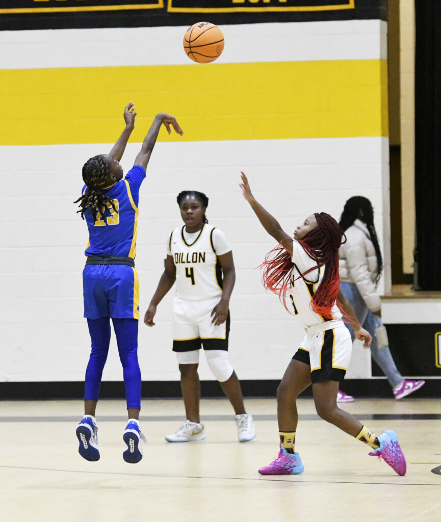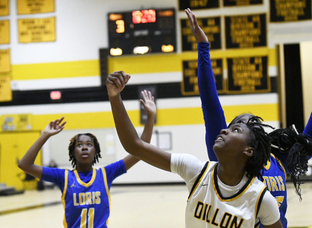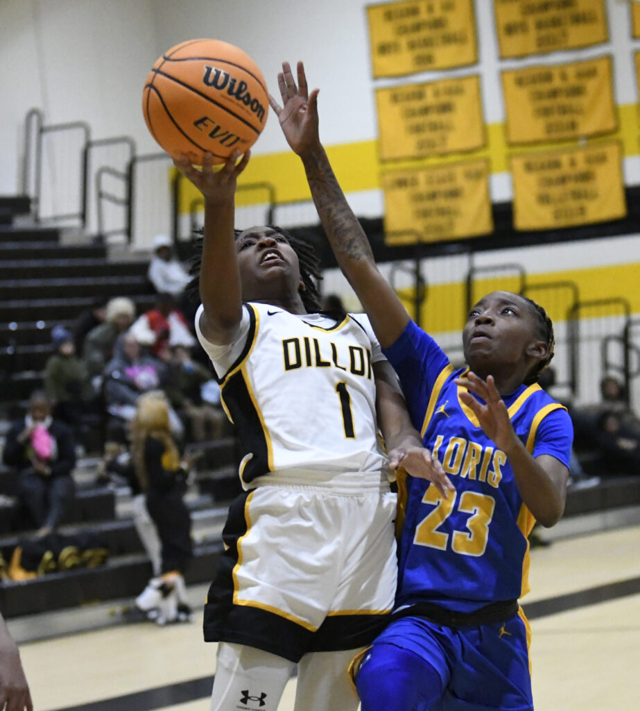 Loris controlled the opening tip-off, and Loris’ Dazena Capers attempted the first 3-point shot of the game. Dillon quickly answered with a 3-point basket by Azyriah Ford followed by 2 free throws by Dillon’s Zynijah Pernell. Loris connected for a free throw followed by a 2-point basket by Ayonna Lester. Dillon’s Khwnylahi McKinnon connected for a 2-point basket to give Dillon a 9-1 lead with 4:59 remaining in the first quarter. Dillon managed to get a 12-3 lead. After the first quarter of play, Dillon was up 13-6. Each team committed 4 fouls in the first quarter.