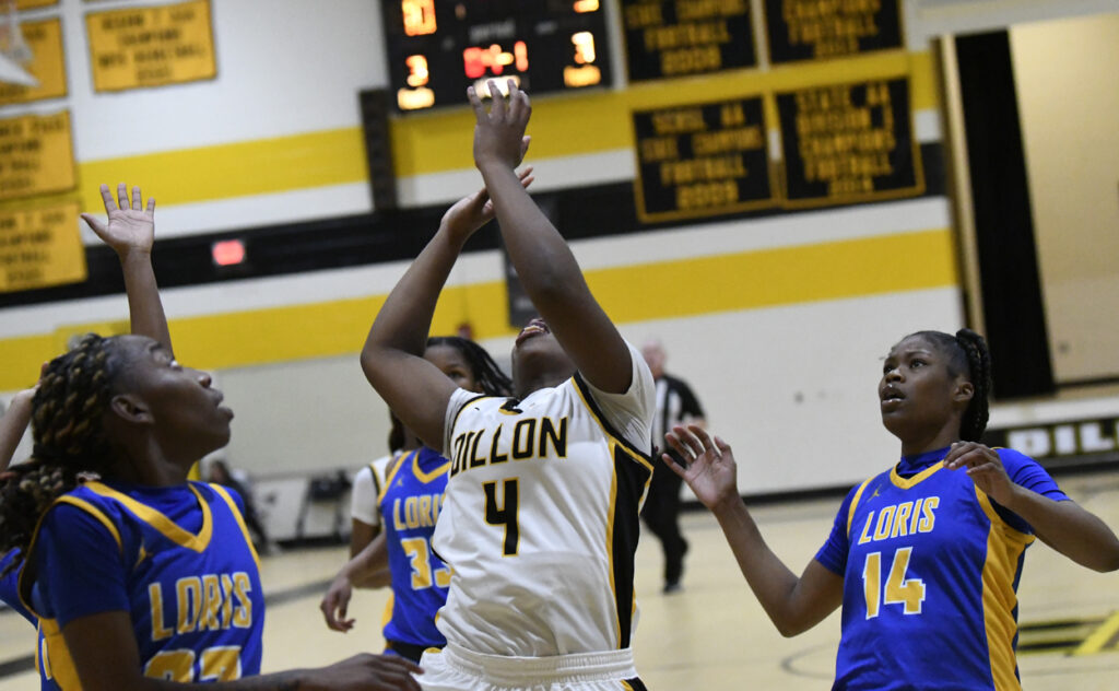 Loris’ Dazena Capers sank a 2-point basket to give the Lady Lions a 31-30 lead that Dillon’s Khwnylahi McKinnon responded with a 3-point basket to give the Lady Wildcats a 31-30 lead. The Lady Wildcats’ Treasure Davis sank a 3-point basket, and Loris’ Mari’Asia Moody responded with a 3-point basket to know the score at 36. Dillon’s Khwnylahi McKinnon sank a free throw to give Dillon a 37-36 lead with 4:38 remaining in the game. McKinnon sank another free throw, and Dillon was up by 2 points. McKinnon followed with a 2-point basket. Loris quickly answered with a 3-point basket by Mari’Asia Moody to cut Dillon’s lead to 1 point, 40-39. Dillon’s Treasure Davis softly banked one in off the glass for 2 points. Dillon had a 3-point lead with 3:06 remaining. Ayonna Lester connected for 2 points for the Lady Wildcats and sank a free throw to give Dillon a 45-39 lead. Mari’Asia Moody connected on a layup for 2 points followed by Dillon’s Treasure Davis who sank 2 free throws. Dillon was up 47-41. Kha’lazia Stephens cut Dillon’s lead to 47-43 on a 2-point basket with 40 seconds remaining in the game. Dillon’s Khwnylahi McKinnon sank a free throw followed by a 2-point basket to give Dillon the 50-43 finish. Dillon committed 3 fouls, and Loris committed 5 fouls in the fourth quarter.