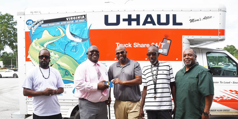 Pictured with the U-Haul is l to r: Douglas Gurley, Wayne McRae, Dillon High School Band Director Adrian Wright, James Gilchrist, and Tony Carmichael