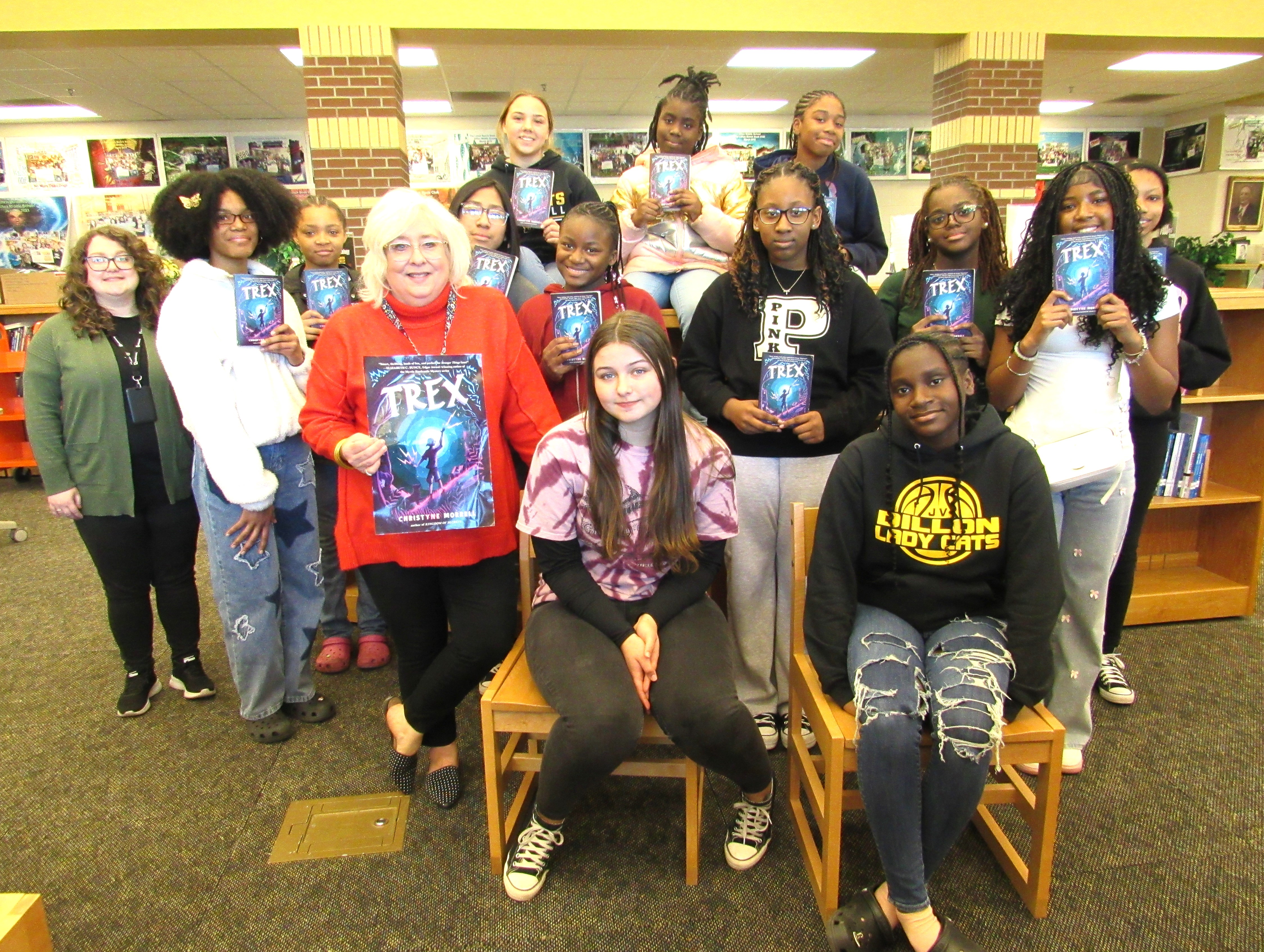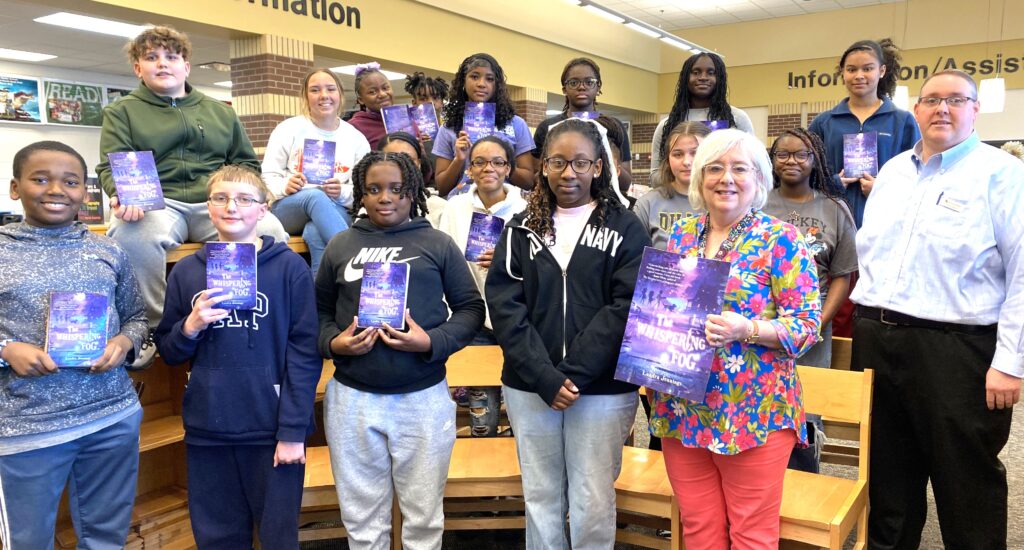 Front row (seated), left to right: Charley Herring and Kanyla Tanksley Second row, left to right: Mrs. Marcia Bethea (school librarian) and Lena Smith Third row, left to right: Mrs. Taylor King (library assistant), Nylah Thomas, Ruben Ruiz, Mardena Manning, Layla Kiza, Lauren Harley, Camille Paige Back row (seated), left to right: Madelyn Willis, Sa’Miyah Sellers, Zy’Iona Williams