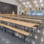 A cafeteria that includes a stage with a state of the art sound and projection system including menu boards to display the food choices.