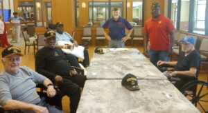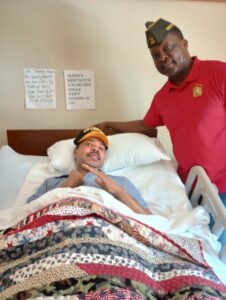 VFW NATIONAL DAY OF SERVICE: On 5/21/2024, the Dillon VFW Post was at Veterans Village in Florence to visit with local Veterans at this State Veterans Home. Post members met with 6 area Veterans and gave them a ballcap marked with their individual branch of service. In this case, it was 5 Army hats and 1 USAF hat. The hats were provided by the Dillon Branch of First Citizens Bank which partnered with the Dillon VFW on this National Day of Service. The Veterans were thanked for their service and VFW Post members listened to their stories about serving in the military. They were told that their military service was appreciated and that they had not been forgotten. Time was taken by all to sing their military service songs – Army & Air Force. Pictured clockwise are ARMY Veteran Richard Wiggins (Dillon), ARMY Veteran Roscoe Gregg (Marion), ARMY Veteran Larry Davis (Dillon), VFW Post Commander John Harlow, VFW Post Quartermaster Joey Williams, and USAF Veteran Lonnie Lane (Marion). Also visited was ARMY Veteran Timothy Hayes (Marion) who was in his room and is pictured separately with VFW QM Joey Williams. ARMY Veteran Roy Lane (Latta) could not be seen because of some health issues. The Veterans Village staff delivered his ARMY hat to his room. The VFW Post is sending each of the Veterans a follow-up letter.