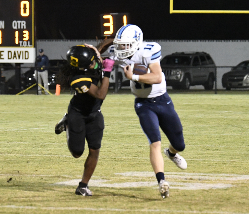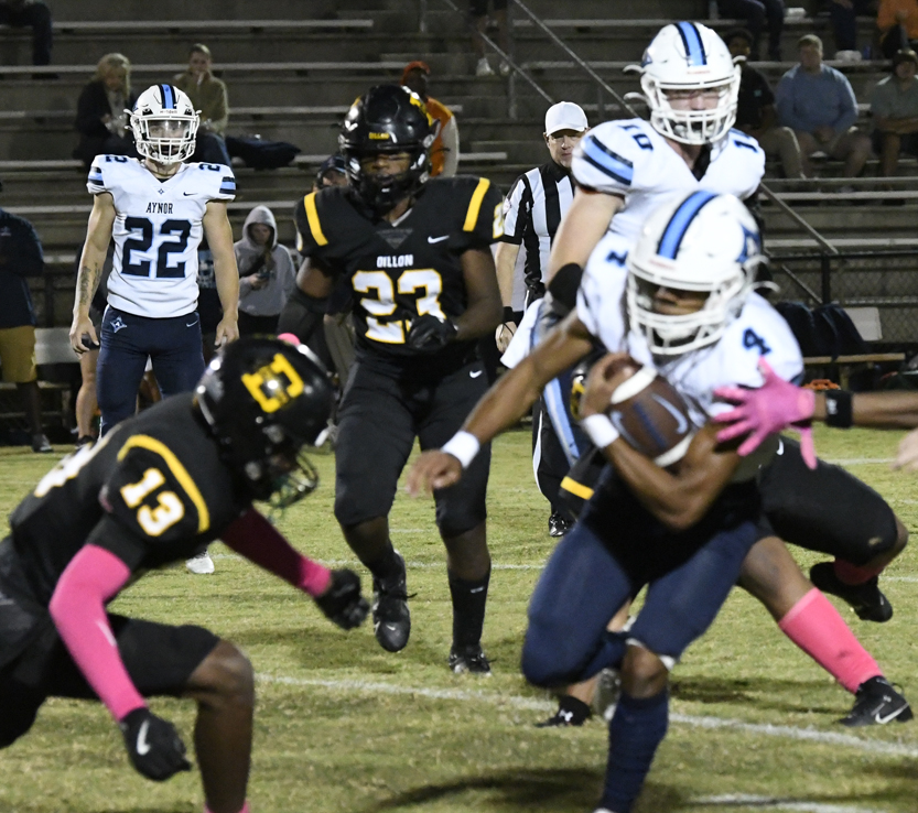 Aynor’s Luke McCracken kept for a first down on fourth and one from Aynor’s own 39-yard line. McCracken picked up another first down prior to relinquishing the football to the Dillon Wildcats.