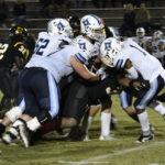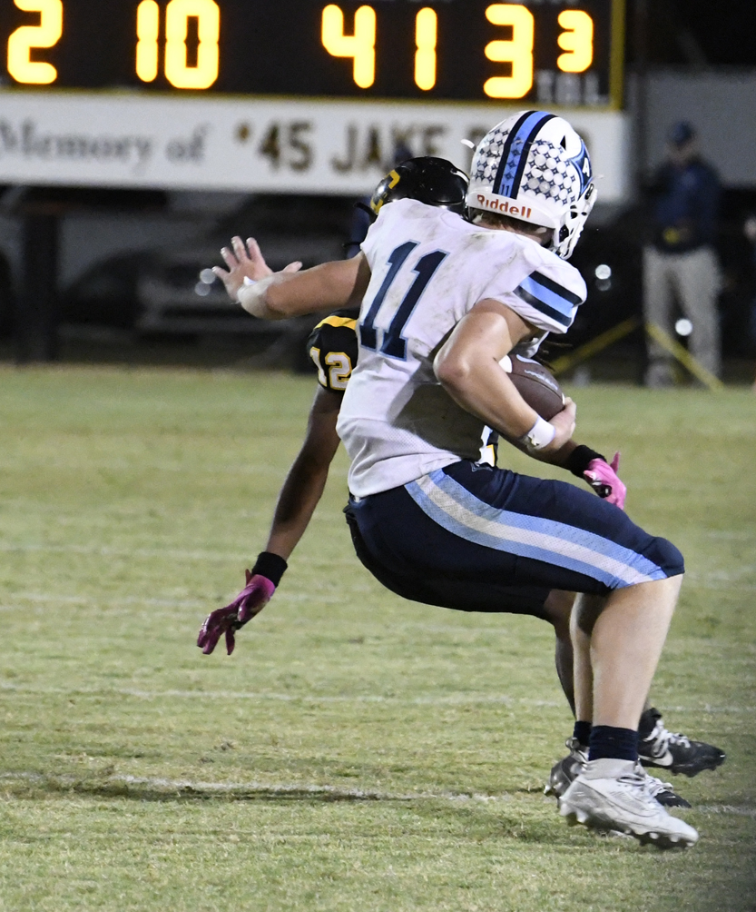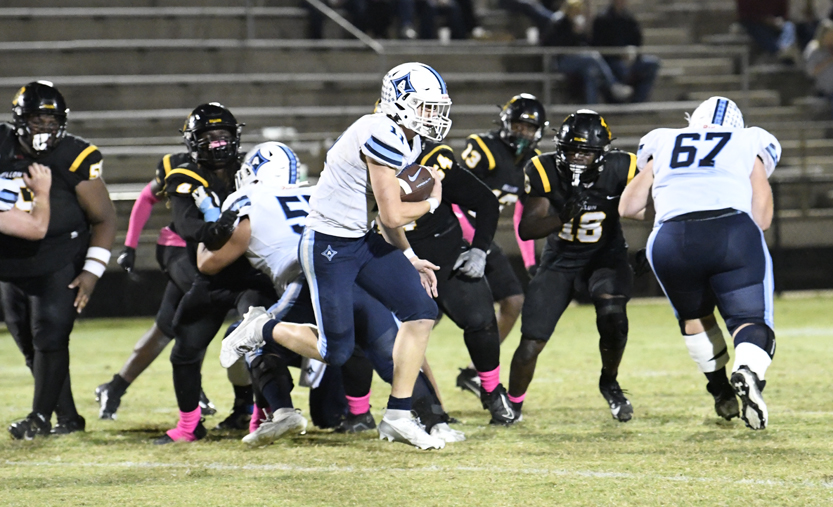 The Aynor Blue Jackets reciprocated with a score by Luke Singleton with 50 seconds remaining in the first quarter. The PAT was good by Luke McCracken to knot the score at 7.