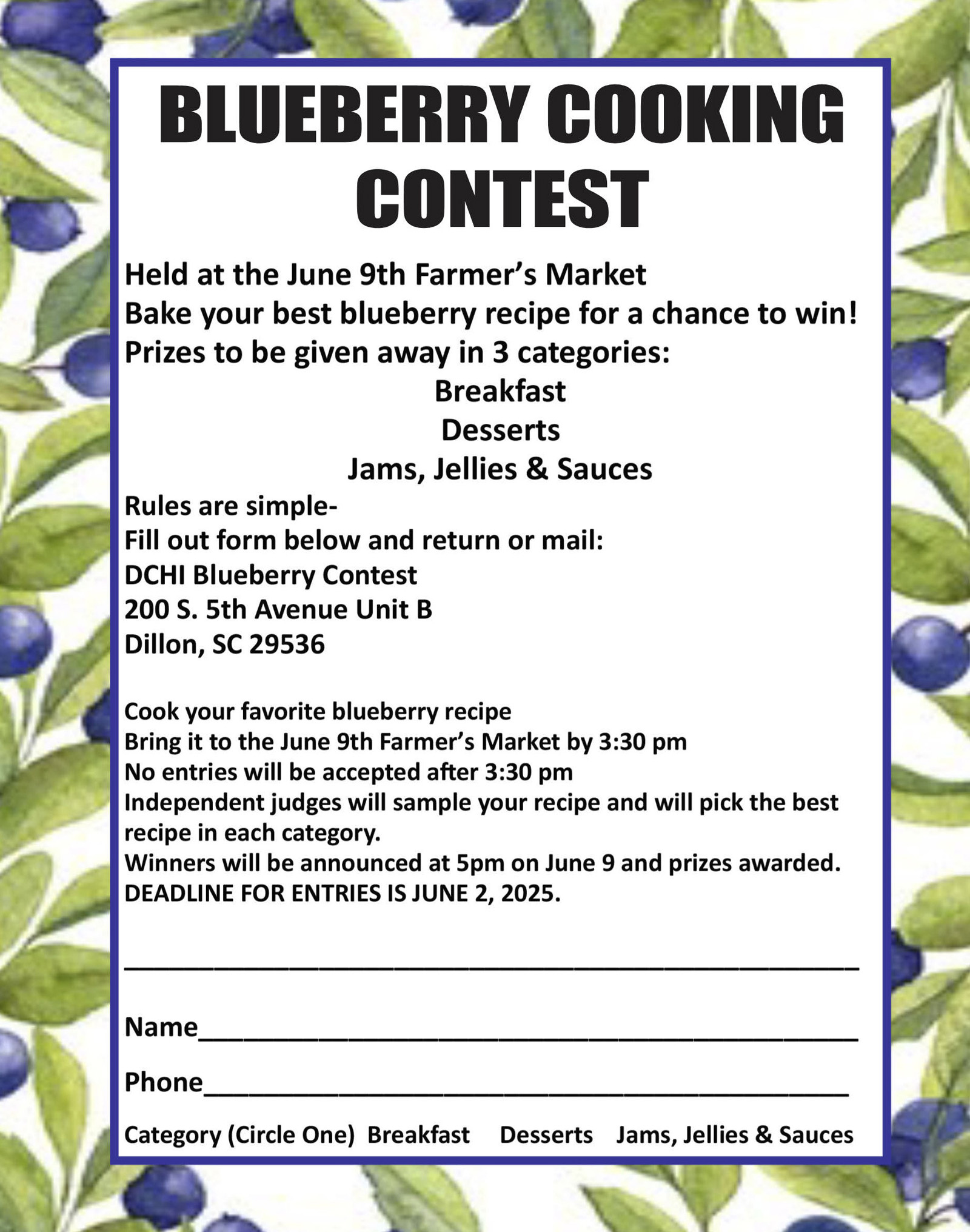 Entries are being sought for the blueberry cooking contest on June 9th at the Dillon County Pop-Up Farmers Market. Prizes will be given away in three categories: Breakfast, Desserts, and Jams, Jullies, and Sauces. See the flier below for details.