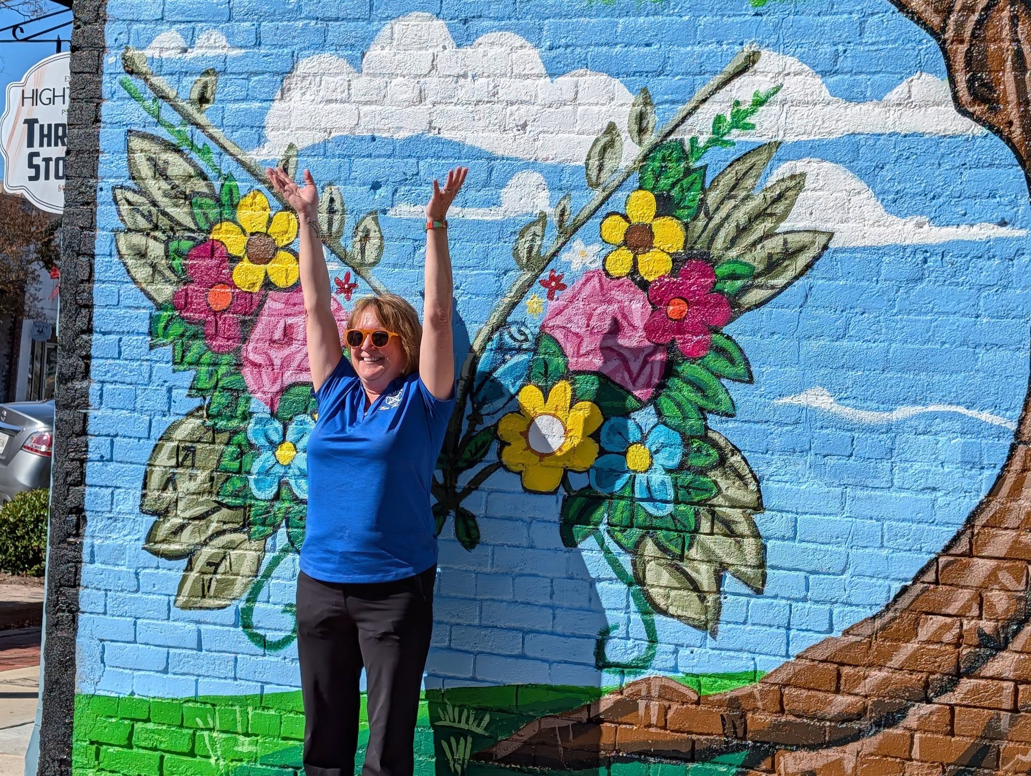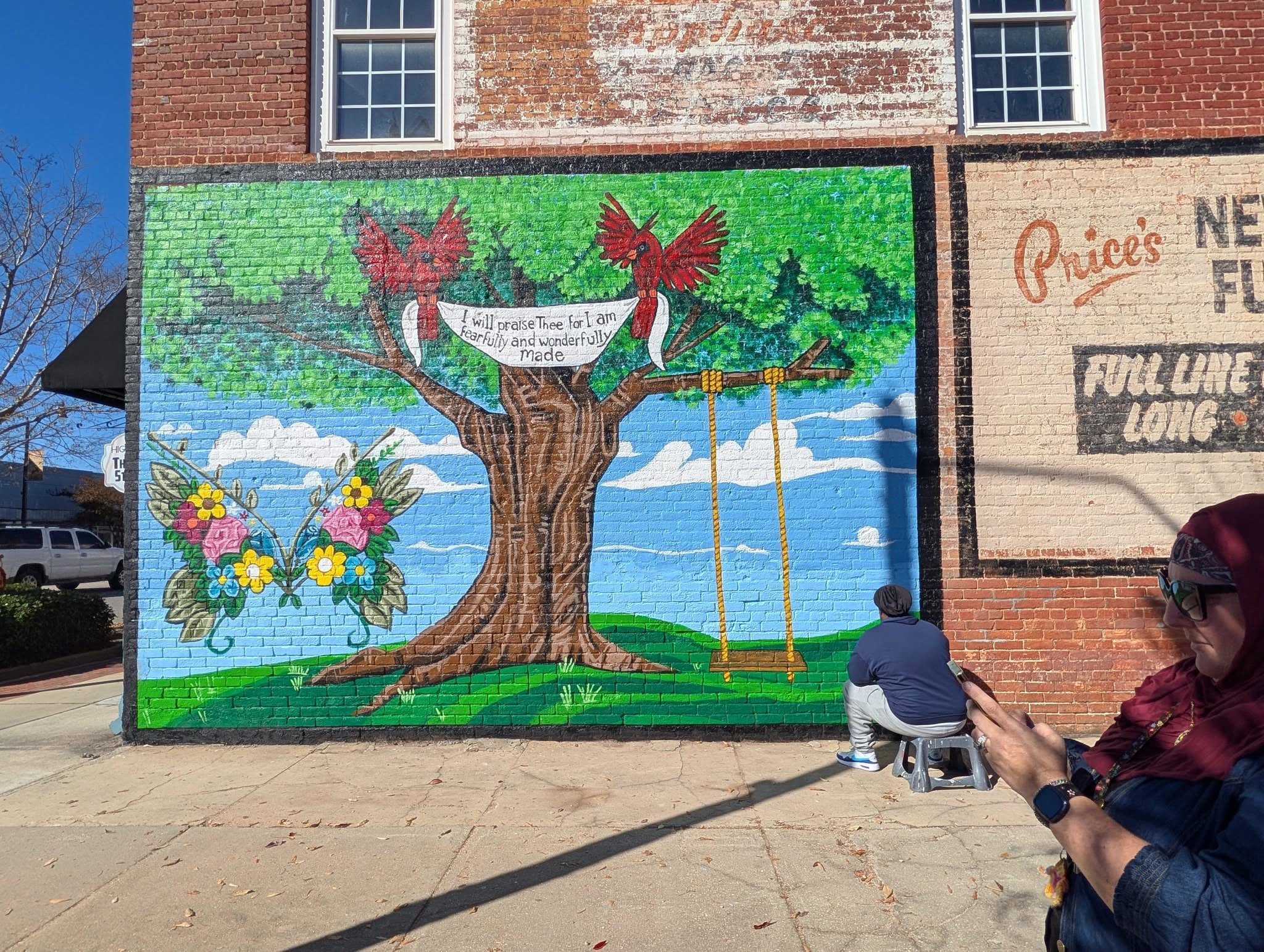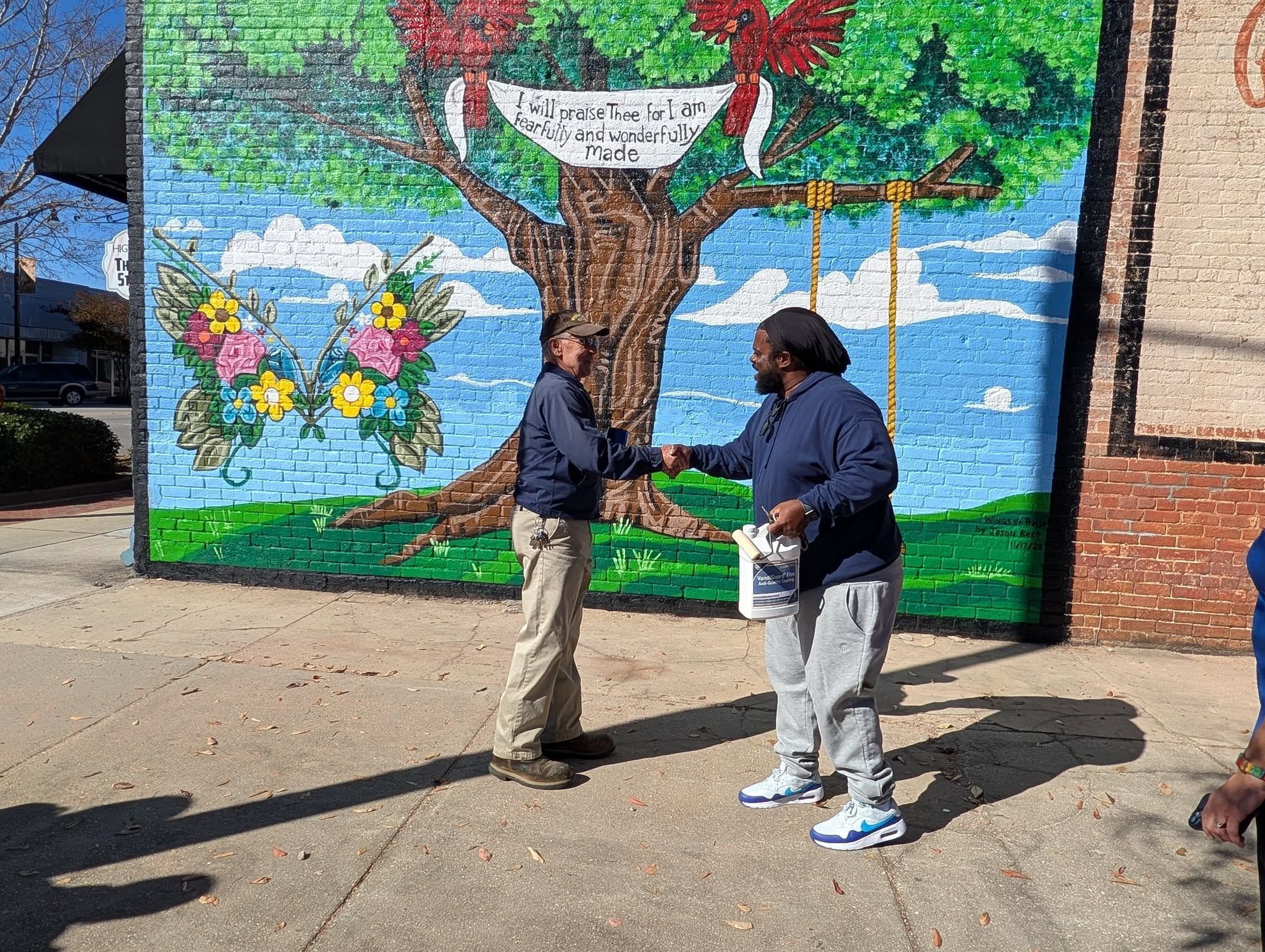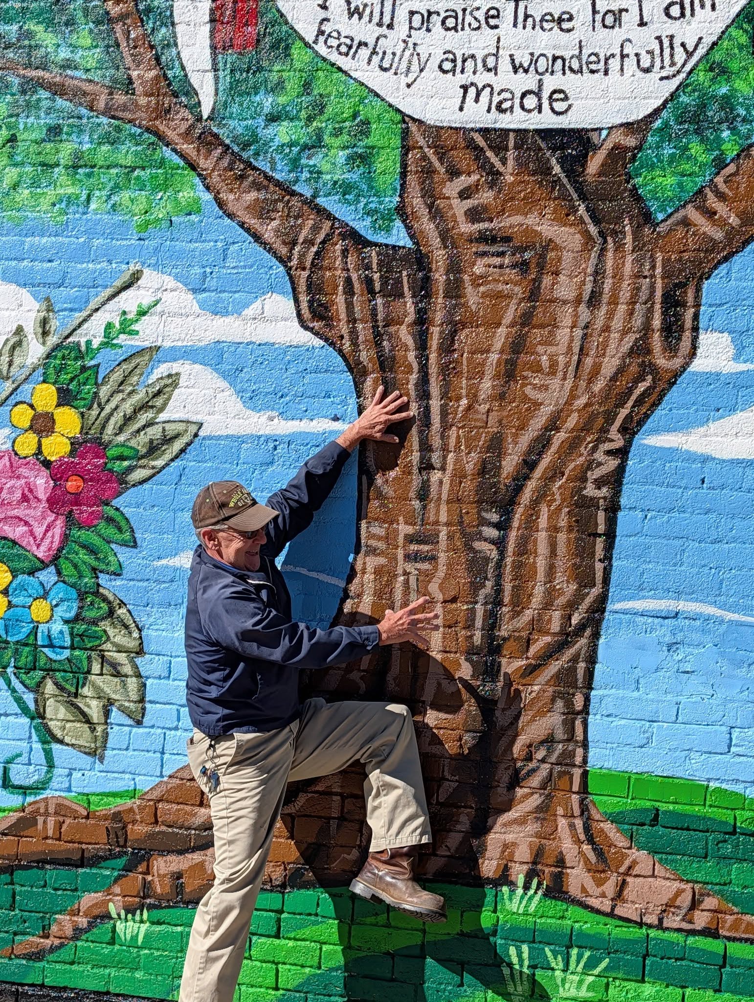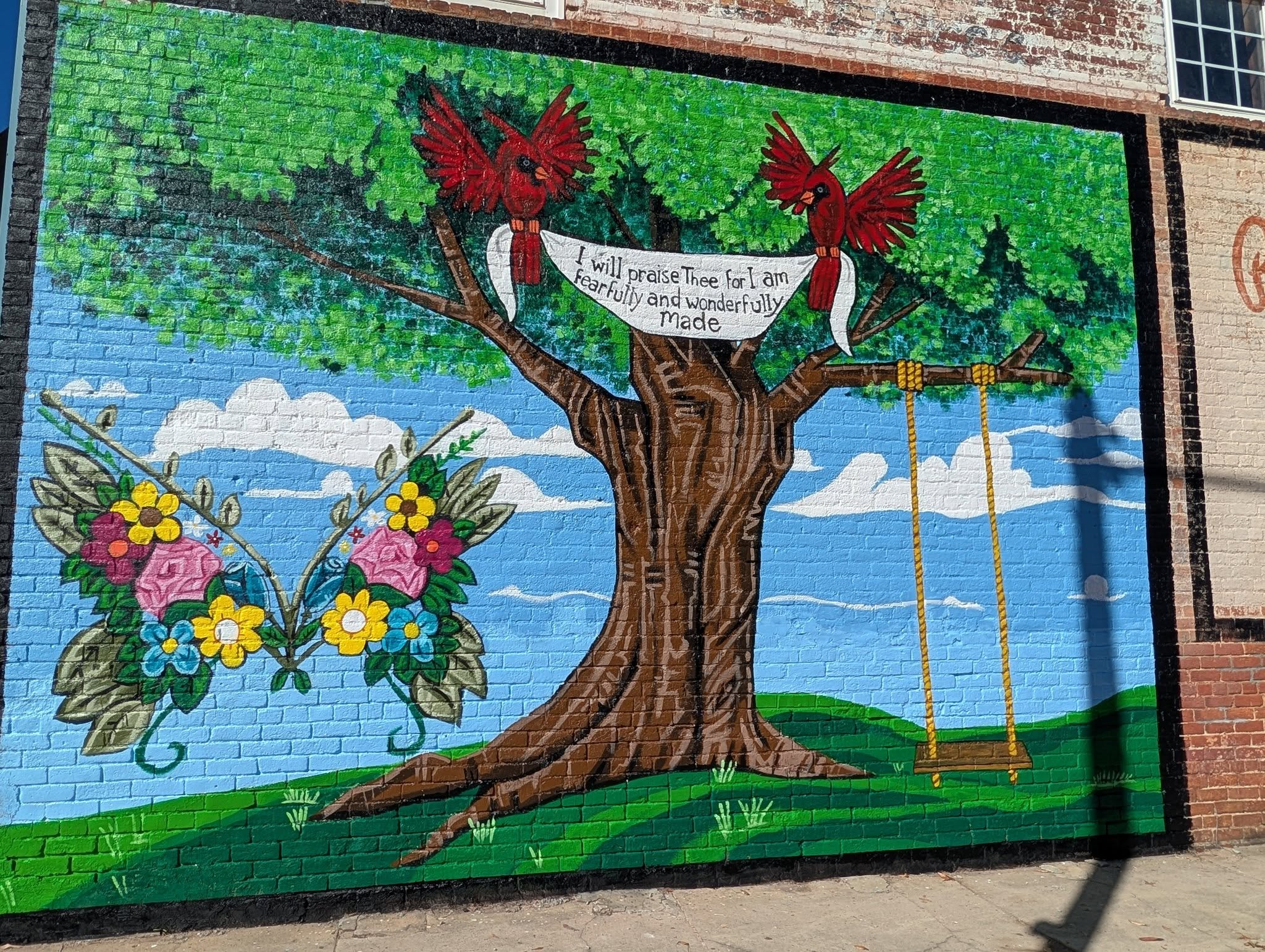 The mural features a large tree that somewhat resembles a cross with two red cardinals holding a banner that says “I will praise thee for I am fearfully and wonderfully made.” The butterfly features some of the colors from the City of Dillon’s logo.