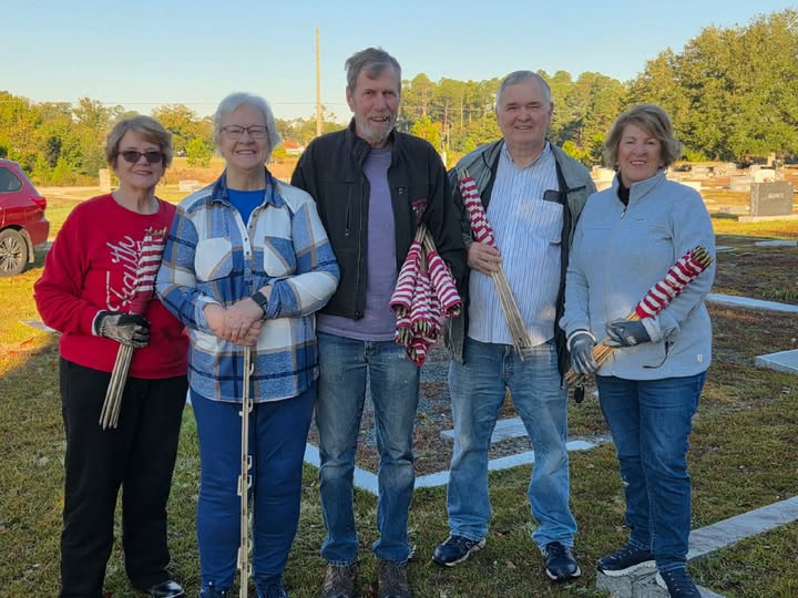 Putting Out Flags On the Graves of Veterans-Marsha Gilbert, Frances McDuffie, Asa McDuffie, Levern Hayes, and Terry Hayes. Not shown is Macie Bailey. (Photo by Johnnie Daniels/The Dillon County News, LLC)
