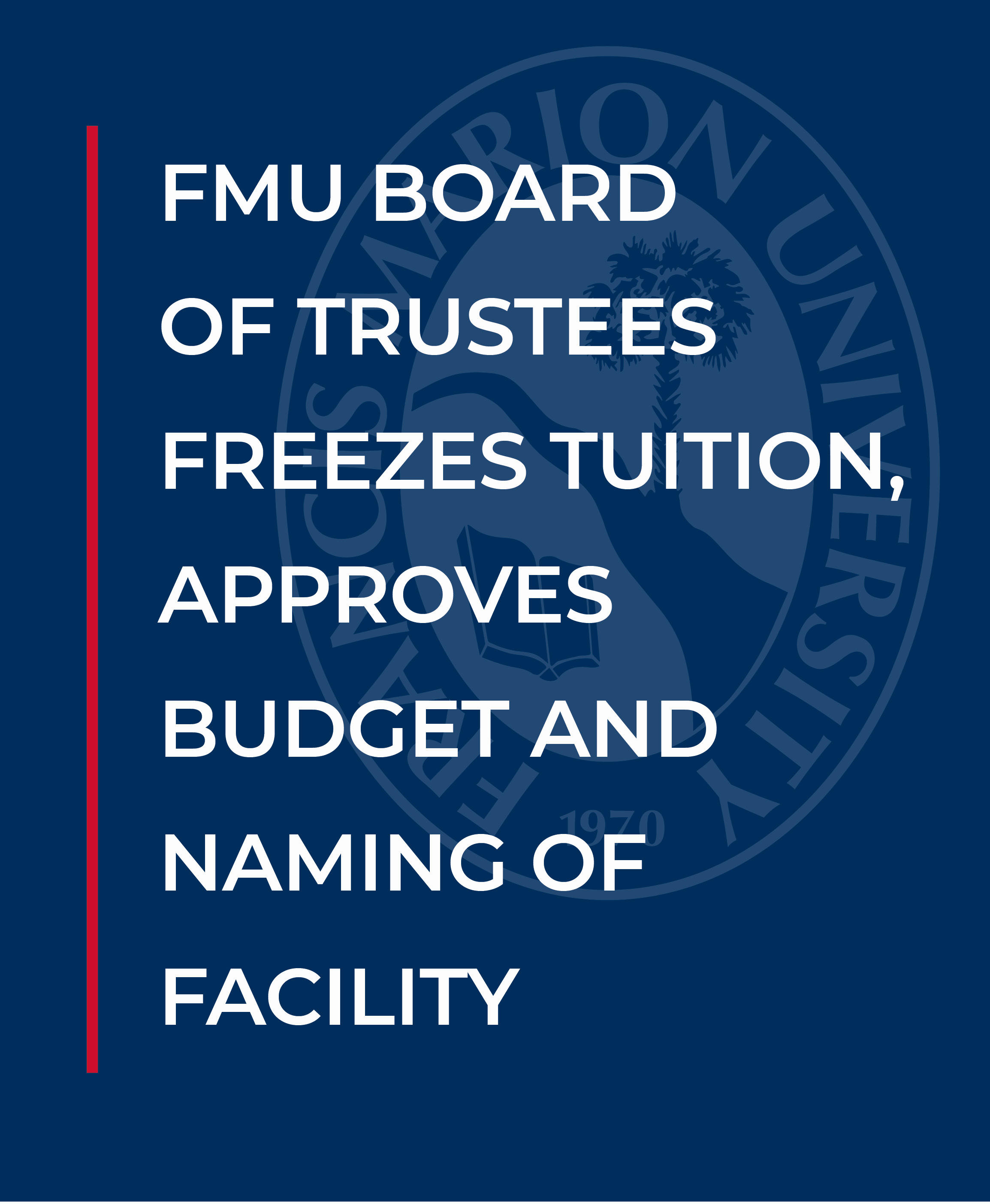 “I am delighted that the Board has once again chosen to freeze tuition,” said FMU President Fred Carter. “The appropriations from the General Assembly, along with generous gifts from our donors, allow us to go another year without increasing the financial burden on our students and their families as they pursue an outstanding education at an affordable cost.”