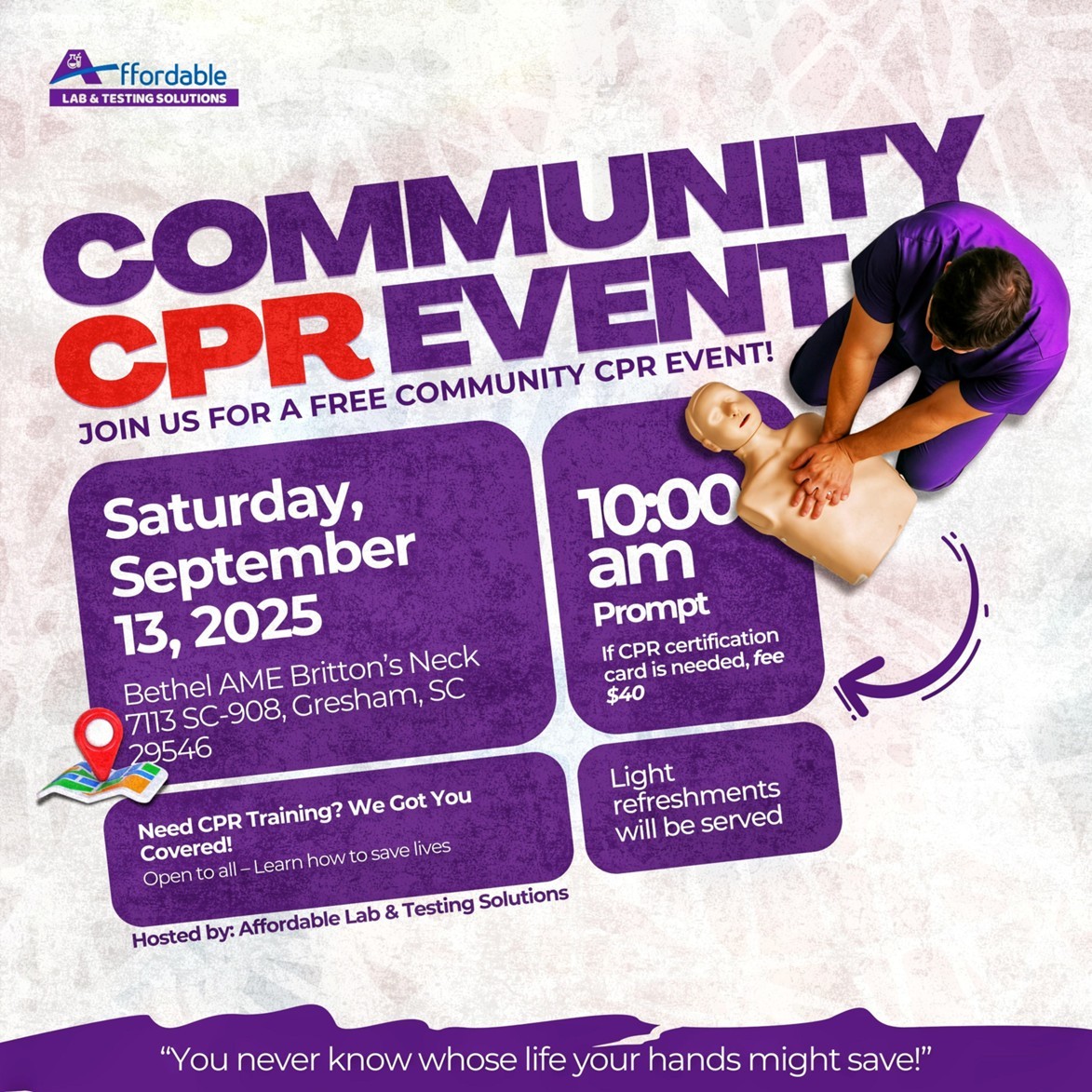 You are invited to join us for a FREE Community CPR Event hosted by Affordable Lab & Testing Solutions! This is your opportunity to learn life-saving skills that could make all the difference in an emergency.