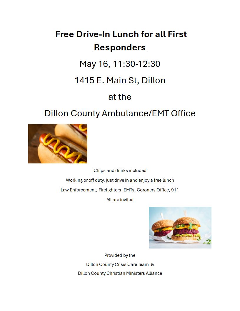 A free drive-in lunch for all first responders will be held on May 16 from 11:30-12:30.