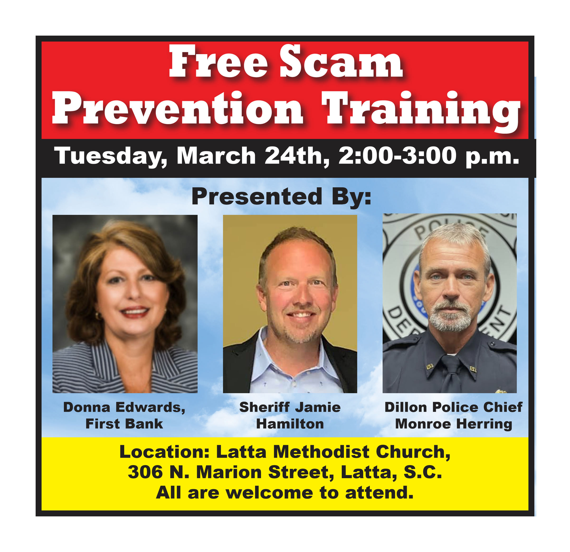 Free Scam Prevention Training will be held on Tuesday, March 24th from 2:00-3:00 p.m. at Latta Methodist Church.