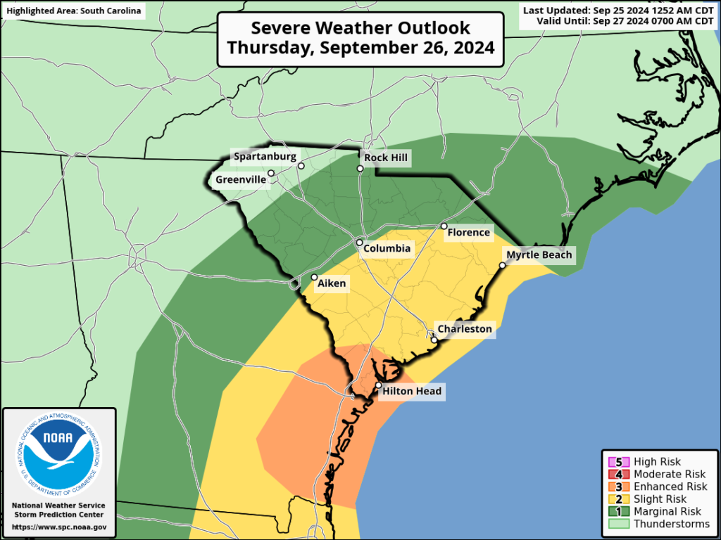 The level 3 of 5 ‘enhanced risk’ area over the Lowcountry is concerning. I’ve said before that concern for a more serious severe storm outbreak hits harder when you see SPC has us in level 3 and up areas. I’ve read that they are evaluating whether to expand that further north and northeast, They might well have to as that area is going to have an unusually favorable setup for tropical tornadoes Thursday and Thursday night. At least a few tornadoes further north and west are likely but will be more isolated. While there might be isolated severe storms with a couple of tornadoes on Thursday, the main time of concern will be Thursday night as Helene barrels northward through the Southeast, especially late at night and the wee hours of Friday.