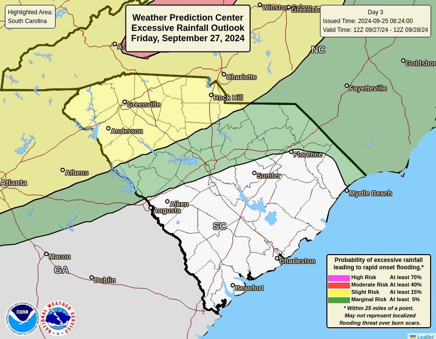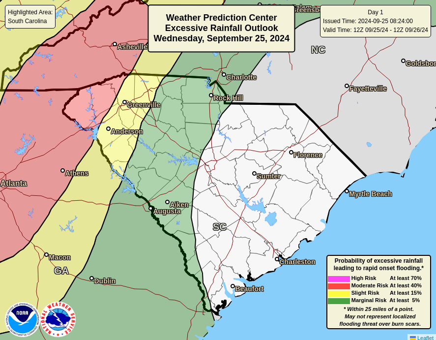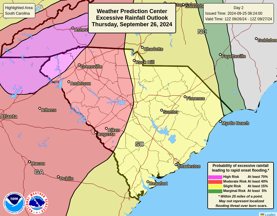 A front that will become stationary over much of the Upstate will cause a predecessor heavy rainfall event through tonight, with the potential for significant flash flooding over the western Upstate and isolated flash flooding in other parts of the state. Extreme rain from Helene will affect much of the state Thursday into Thursday night, resulting in widespread flash flooding for the Upstate, especially areas that get heavy rain through tonight. In that area, some areas that see flooding only in the most extreme rain events will flood, and the high-risk area indicates the risk for severe flash flooding and should be taken very seriously. Flash flooding may be widespread and significant in the ‘Moderate Risk’ areas. In the green and yellow areas, there can be isolated flash flooding from heavy rain, with yellow areas at a somewhat higher risk.