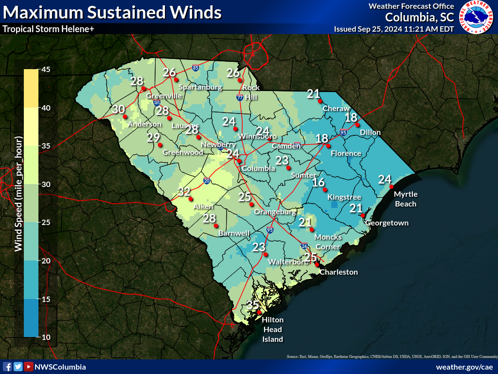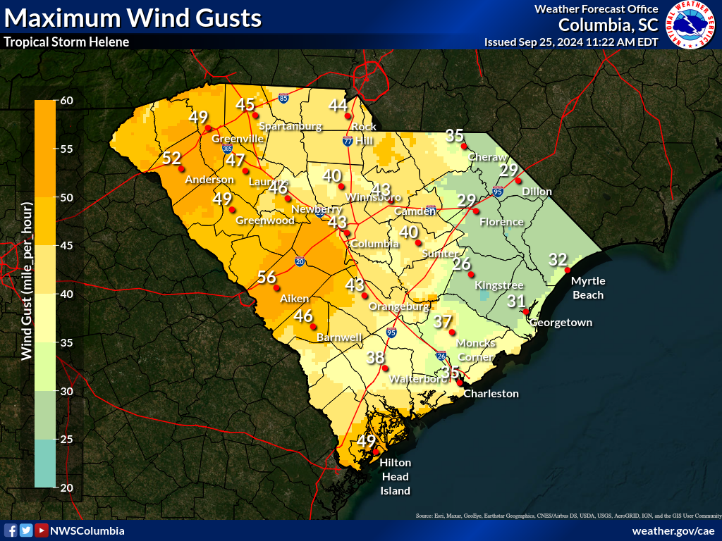 Wind remains a concern for parts of the state; locally damaging wind may result in isolated tree and power line damage, mainly to the southwest of I-26. The damaging wind potential would be greater and more widespread should Helene track on the east side of the current uncertainty cone.