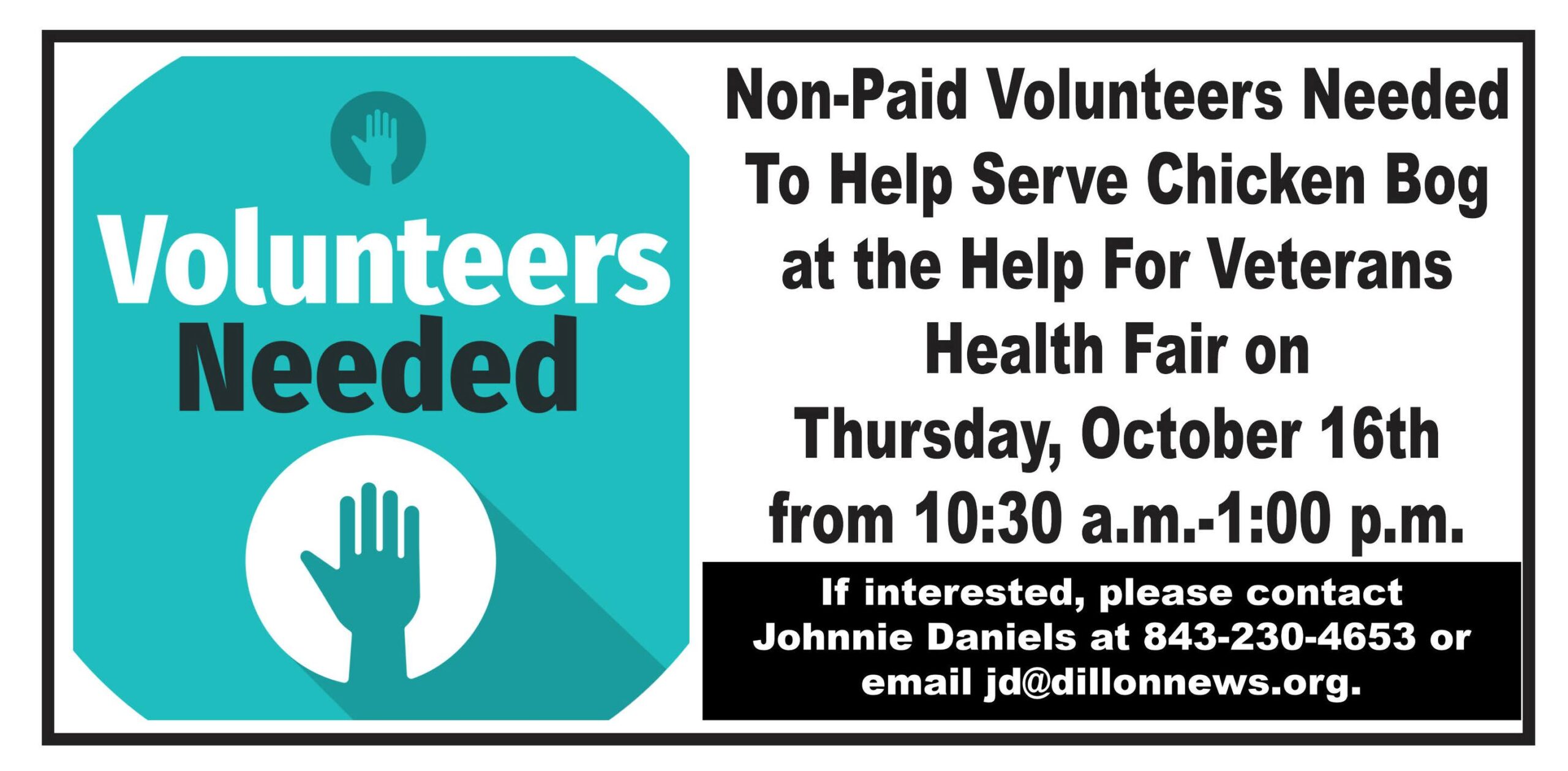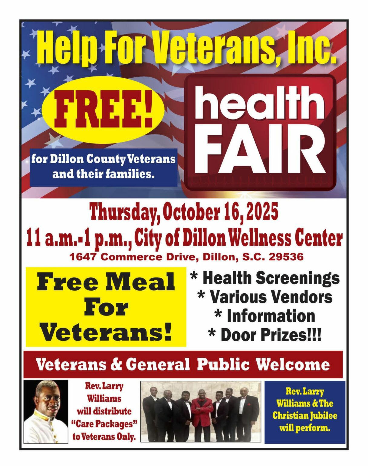 The Help For Veterans Health Fair is October 16th at the City of Dillon Wellness Center, 1647 Commerce Drive, Dillon.