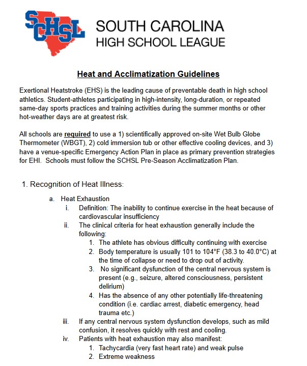 Here are the heat and acclimations rules in detail from the S.C. High School League website (https://schsl.org/archives/11549):