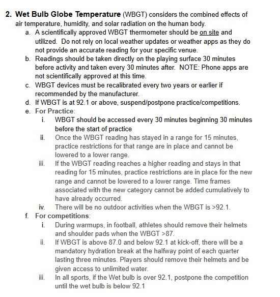 Public high school are required to have a wet globe temperature monitor. According to the National Weather Service, “The WetBulb Globe Temperature (WBGT) is a measure of the heat stress in direct sunlight, which takes into account: temperature, humidity, wind speed, sun angle and cloud cover (solar radiation). This differs from the heat index, which takes into consideration temperature and humidity and is calculated for shady areas. If you work or exercise in direct sunlight, this is a good element to monitor. Military agencies, OSHA and many nations use the WBGT as a guide to managing workload in direct sunlight.”