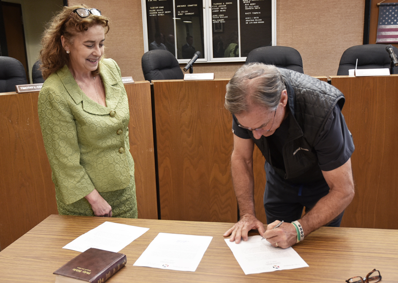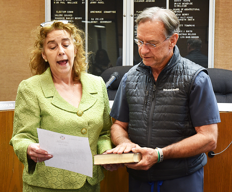 DILLON CITY DISTRICT FIVE COUNCILMAN Jay David was sworn into office for another tern on Monday night in the Dillon CIty Council Chambers prior to the city council meeting. Administering the oath was City Attorney Janet Altman Paschal. (PHOTOS BY JOHNNIE DANIELS/THE DILLON COUNTY NEWS, LLC)