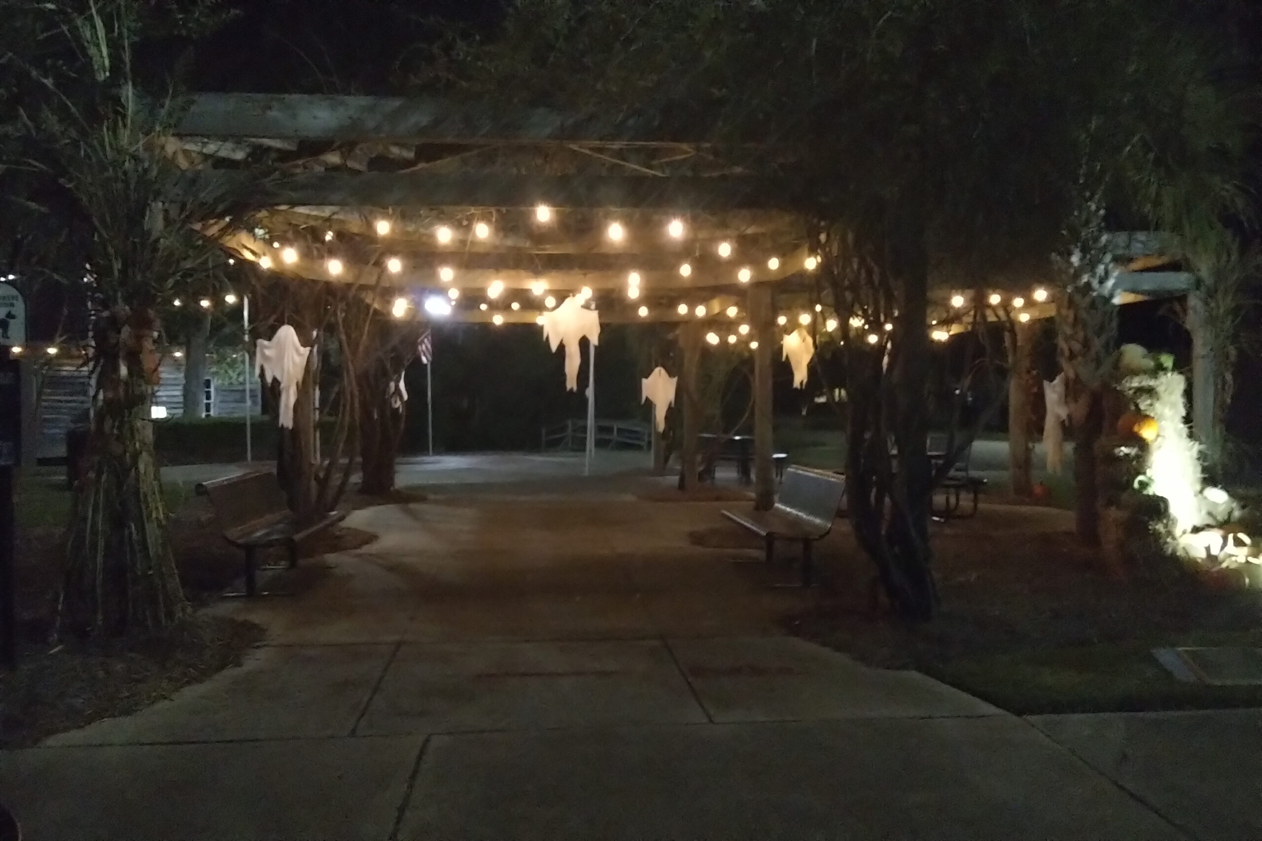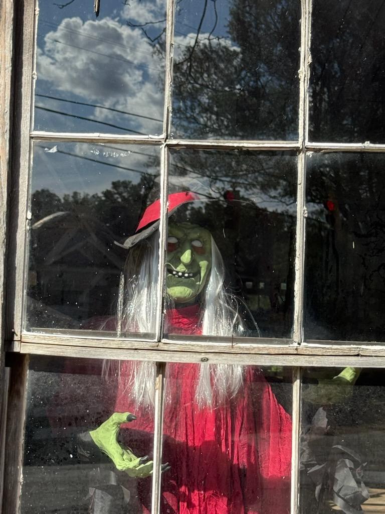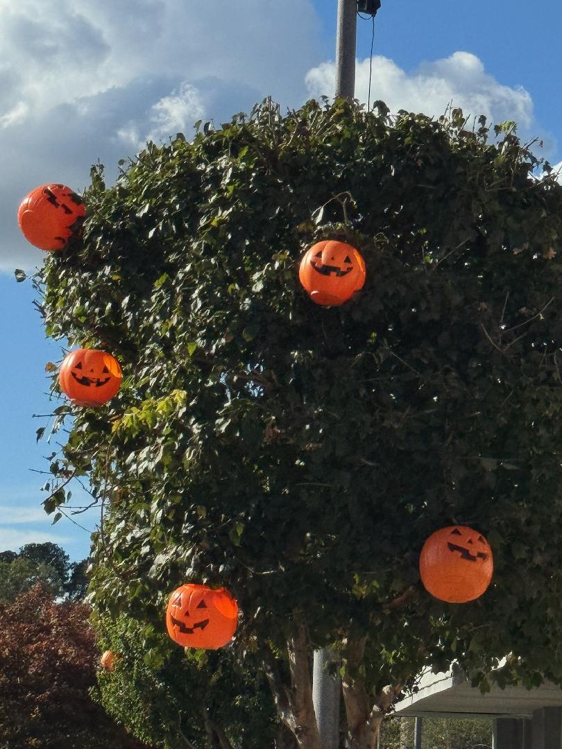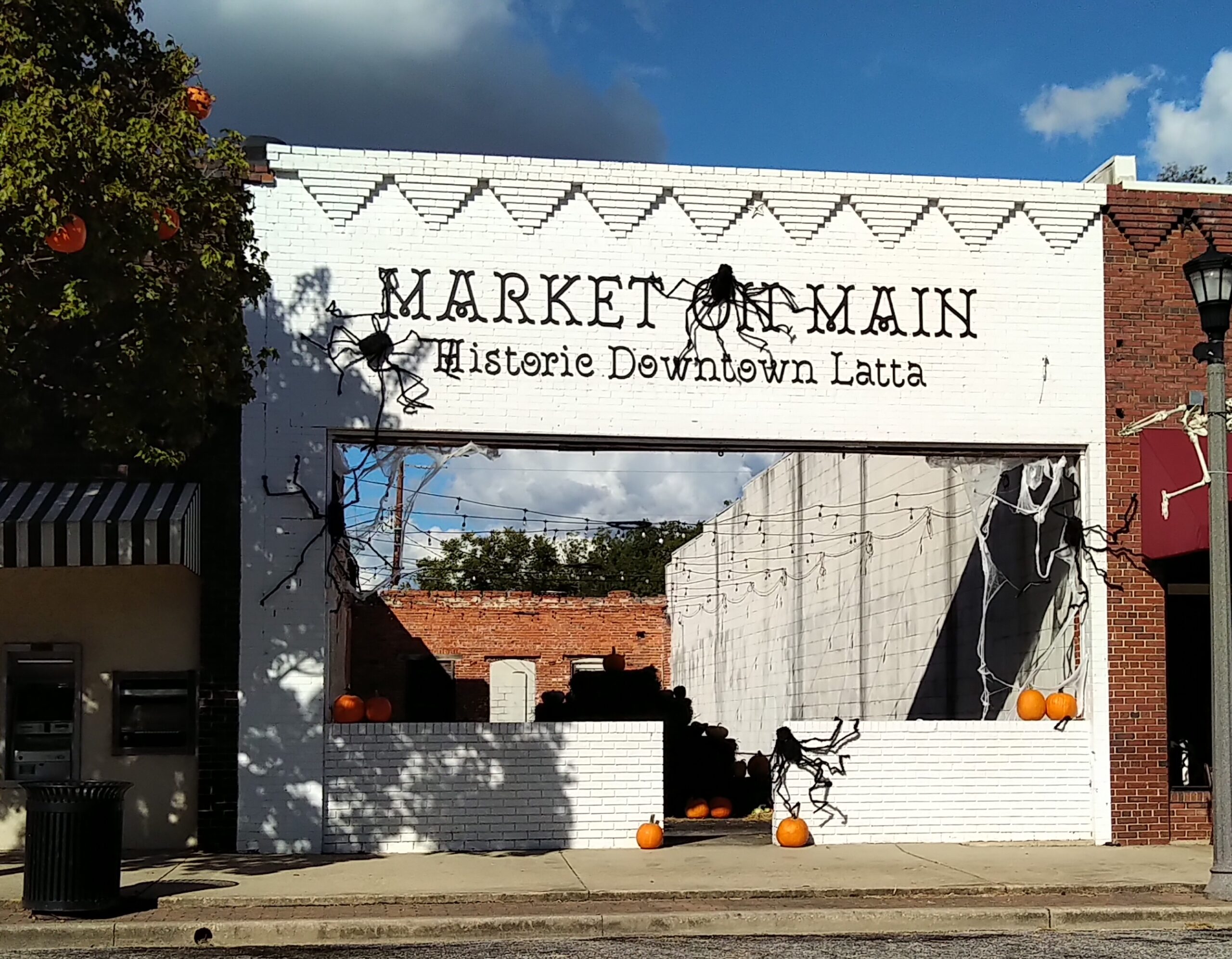 It’s beginning to look like Hallowe’en in downtown Latta. In the day, it’s a beautiful celebration of fall with pumpkins, mums, and touches of Hallowe’en with ghosts and skeletons. The Main Street Market is covered with spiders and cobwebs.