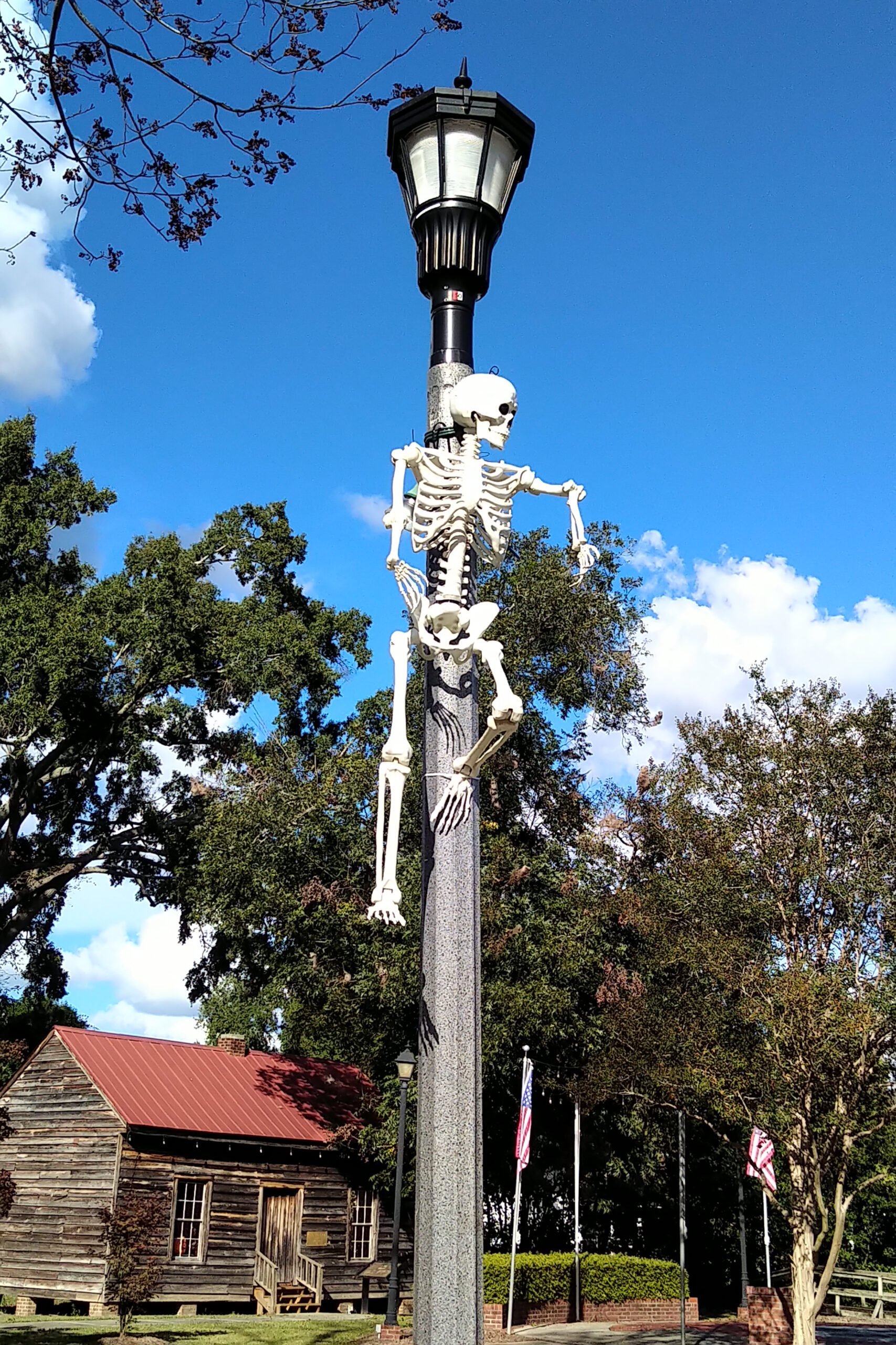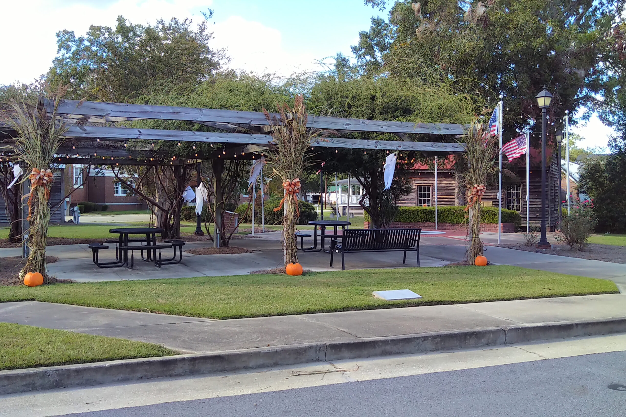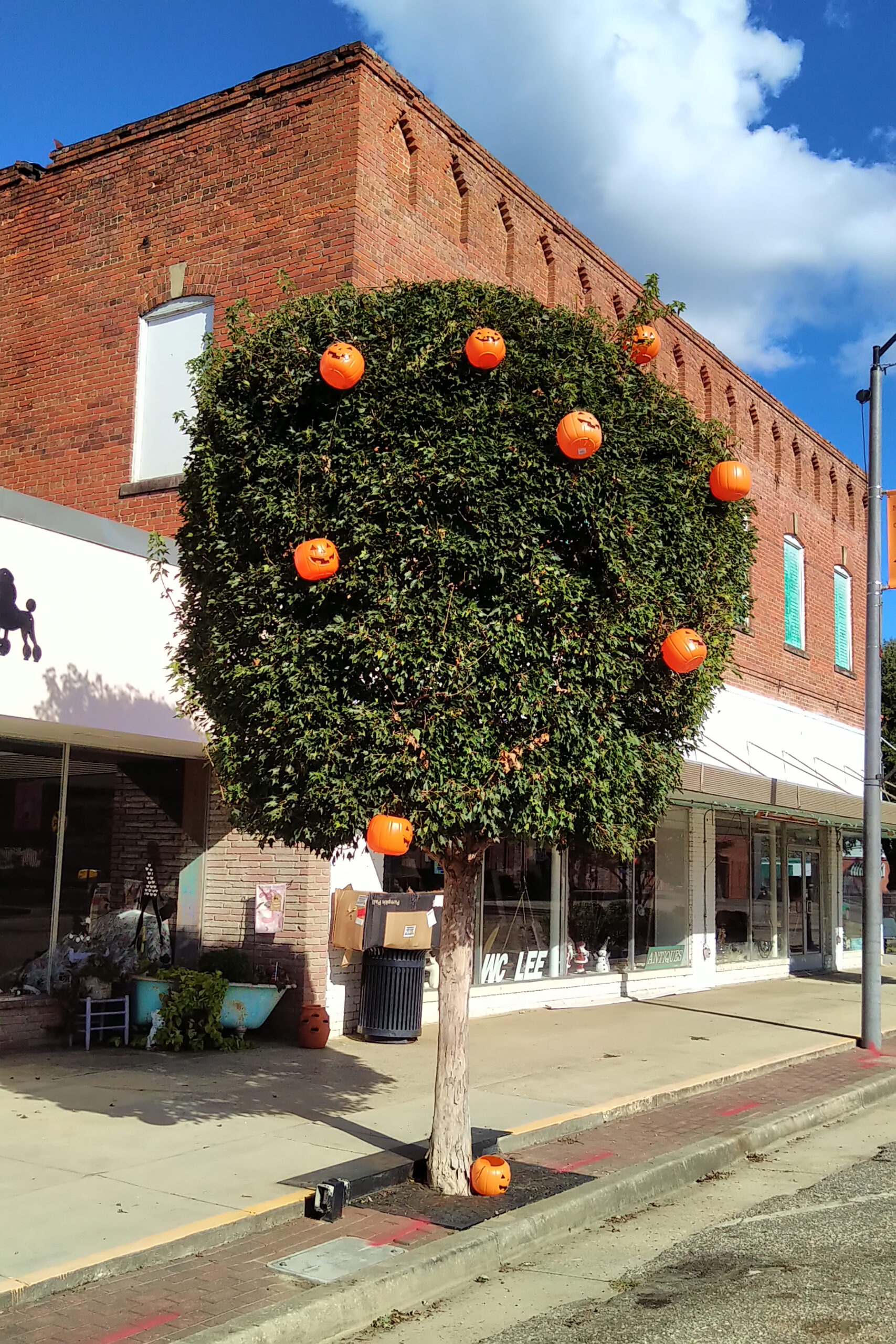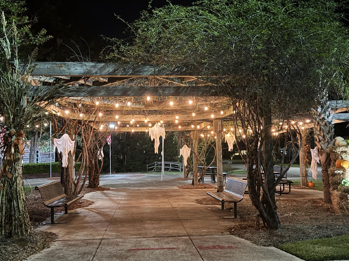 It’s beginning to look like Hallowe’en in downtown Latta. In the day, it’s a beautiful celebration of fall with pumpkins, mums, and touches of Hallowe’en with ghosts and skeletons. The Main Street Market is covered with spiders and cobwebs.